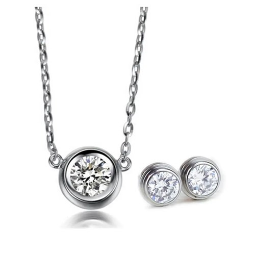 Detta set av smycken består av ett halsband och örhängen i rostfritt stål med en liten gnistarnde sten. Halskedjan och örhängena är nätta och stilrena vilket gör att de passar många tillfällen och stilar.