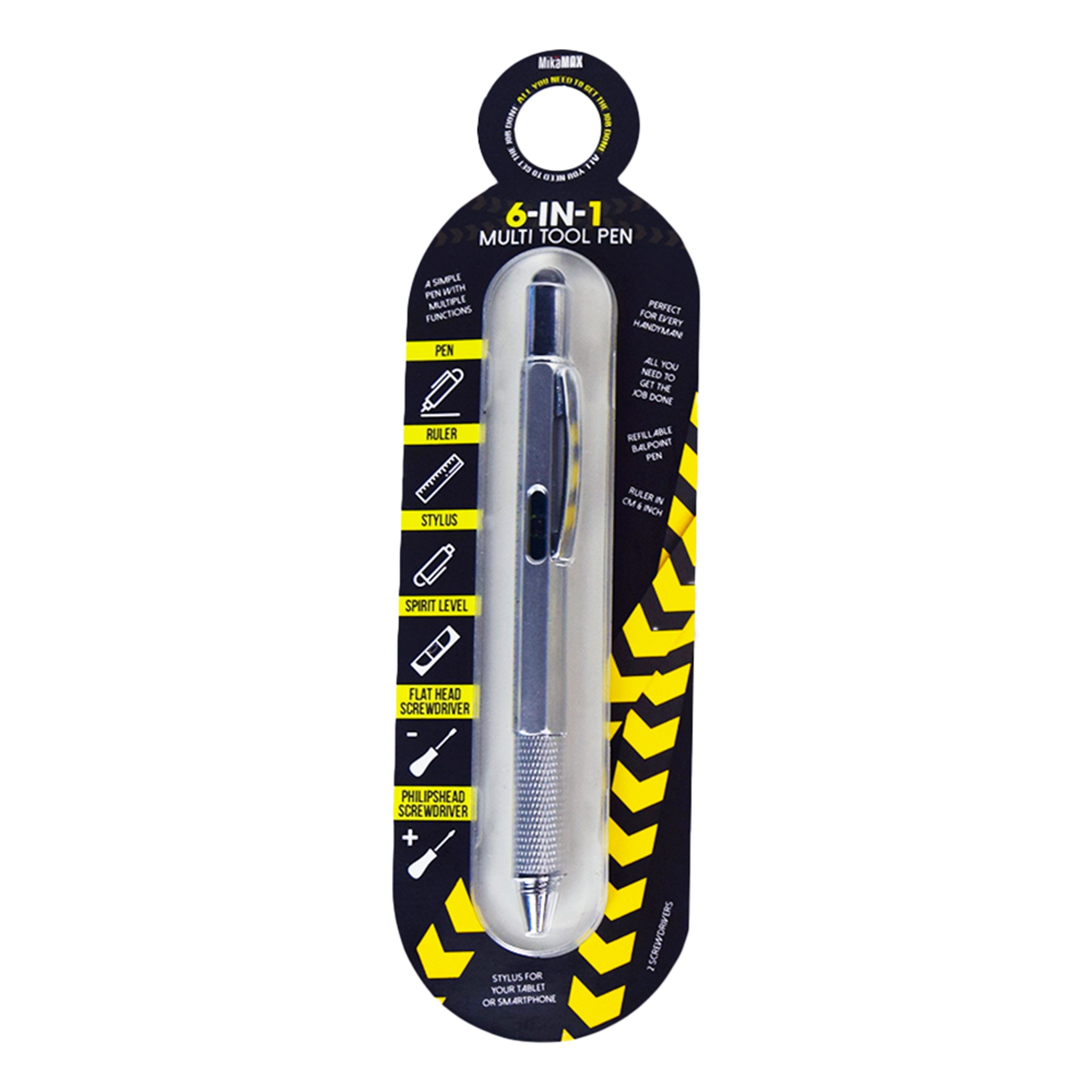 6-i-1 Multiverktyg Penna innehåller 6 olika verktyg och kommer i 3 olika färger; svart, gul och silver. Detta är den perfekta pennan för alla gör-det-själv:are. Perfekt present till pappa i julklapp eller farsdag-present!