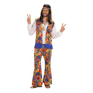 Hippie Maskeraddräkt inkluderar en vit tröja med en fastsydd blommig väst i massor av olika färger. Västen har också blåa fransar. Ett par blommiga byxor ingår också tillsammans med ett pannband i samma tyg samt ett halsband med fredstecknet.