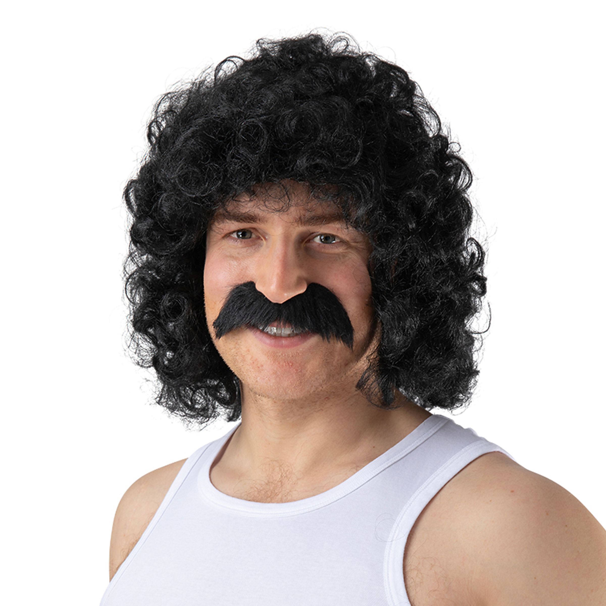 70-tals Svart Perukset är en svart peruk med lockigt hår som nästan går ner till axlarna. Perfekt till 70-talsfesten! Komplettera med hårnät för att peruken ska sitta perfekt hela festen lång.