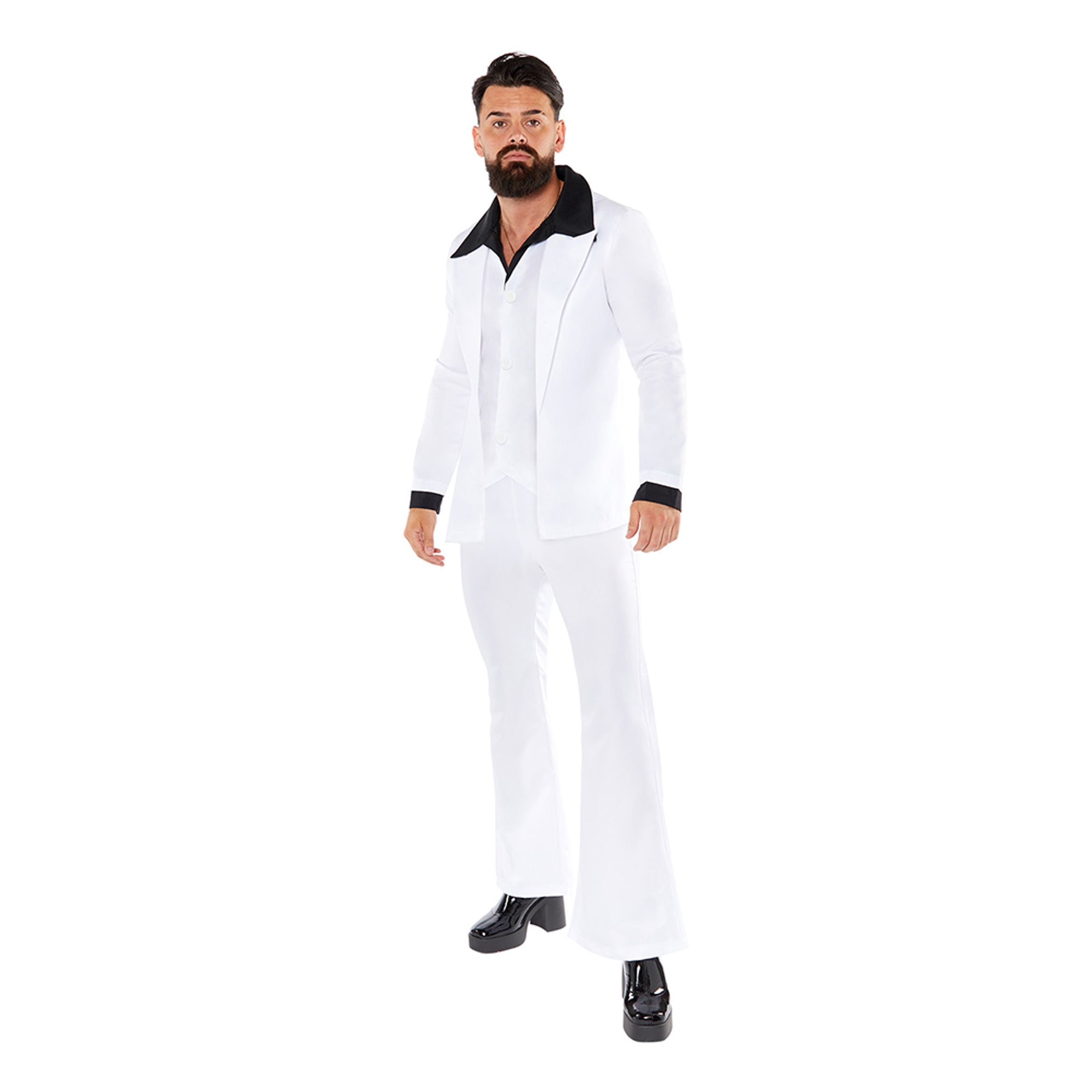 70-tals Vit Kostym Maskeraddräkt inkluderar en komplett kostym där det ingår en kavaj med fastsydd skjorta och krage. Det medföljer även ett par vita byxor med vida ben. Komplettera med passande skor och du är redo för 70-talsfesten!