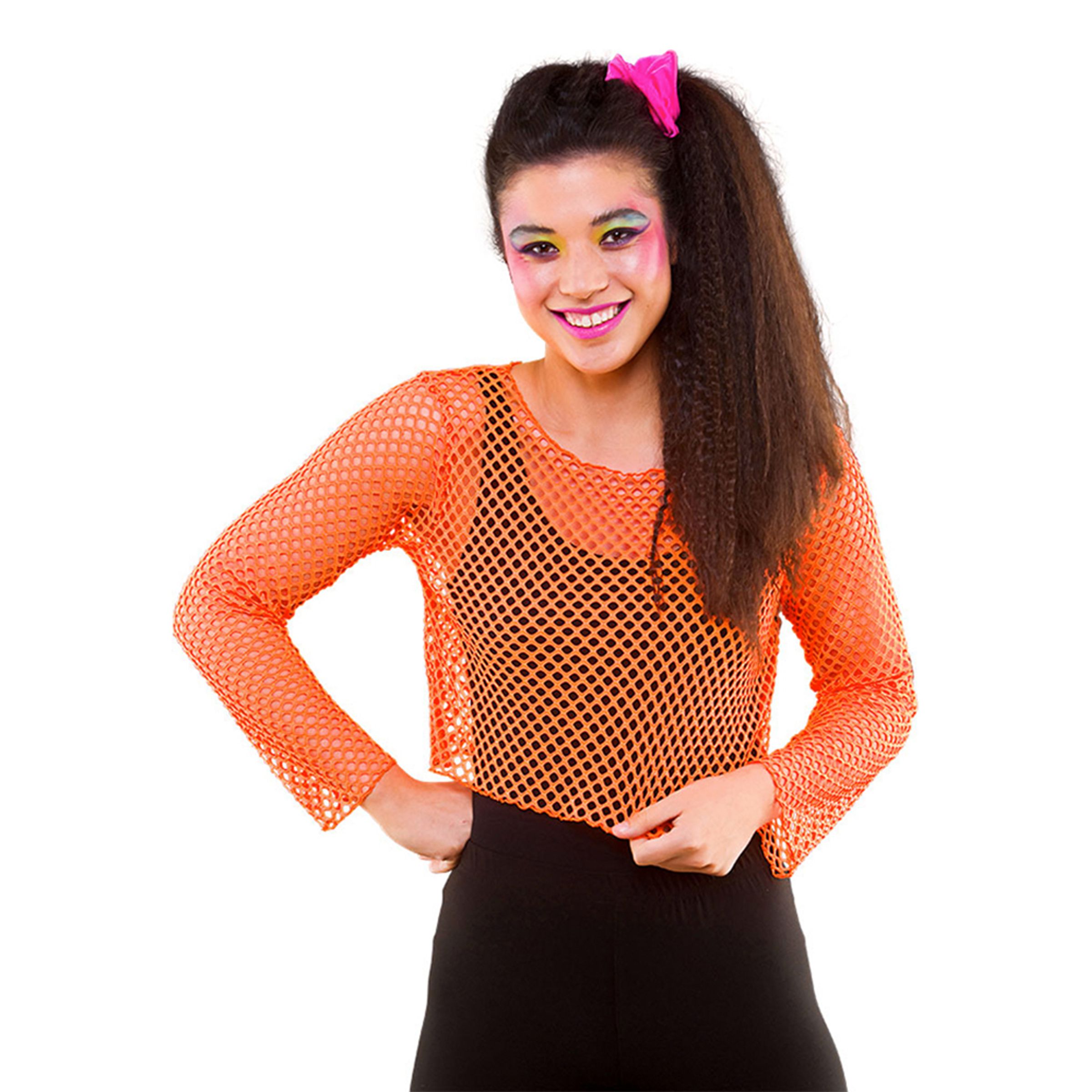 80-tals Fisknätströja Kort Neonorange kommer i storlekarna one size och plus size för vuxna. Toppen är tillverkad i polyester och kommer i en kort modell. Passar perfekt till ravet, 80-talsmaskeraden eller varför inte till halloweenfesten?