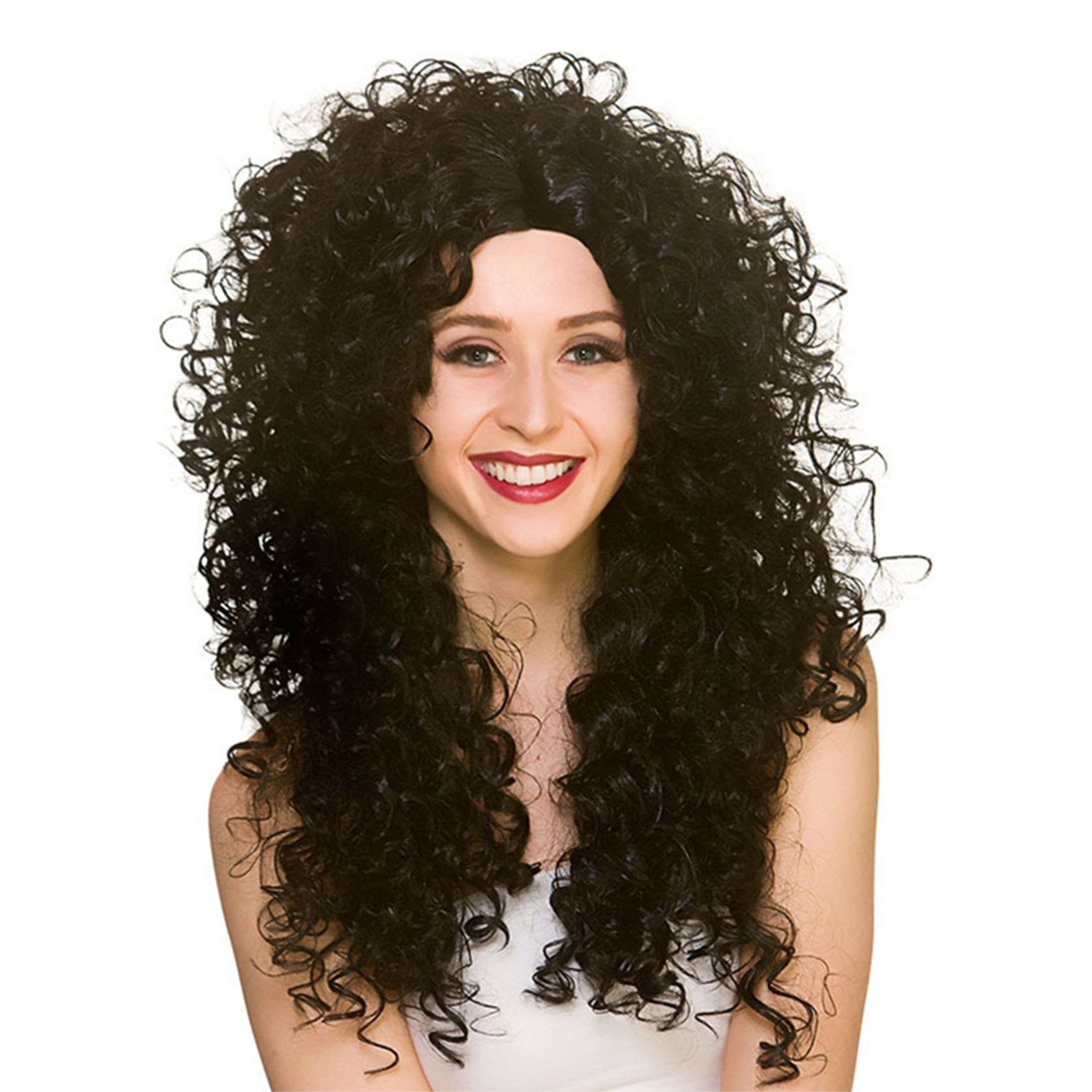 80-tals Lång Lockig Svart Peruk består av långt, svart hår som är stylat med mängder av små lockar, vilket ger den ett rufsigt utseende. För att den ska sitta så bra som möjligt på huvudet rekommenderas det att du kompletterar med ett hårnät för att få undan ditt eget hår.