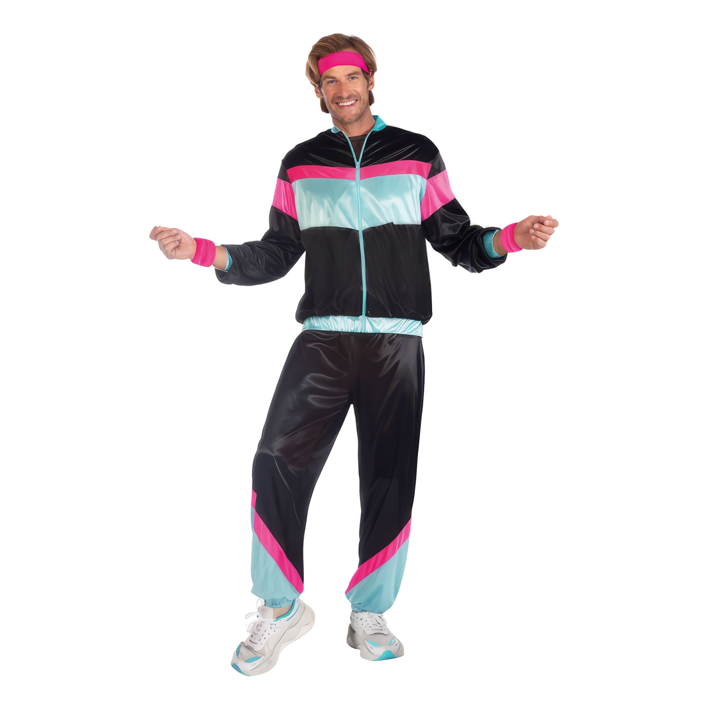 80-tals Svart Träningsoverall Herr Maskeraddräkt består av en svart jacka och byxor med ljusblå och lila detaljer. Den kan med fördel kombineras med en tidsenlig peruk (eller frisyr) och en skamlöst stor mobiltelefon.