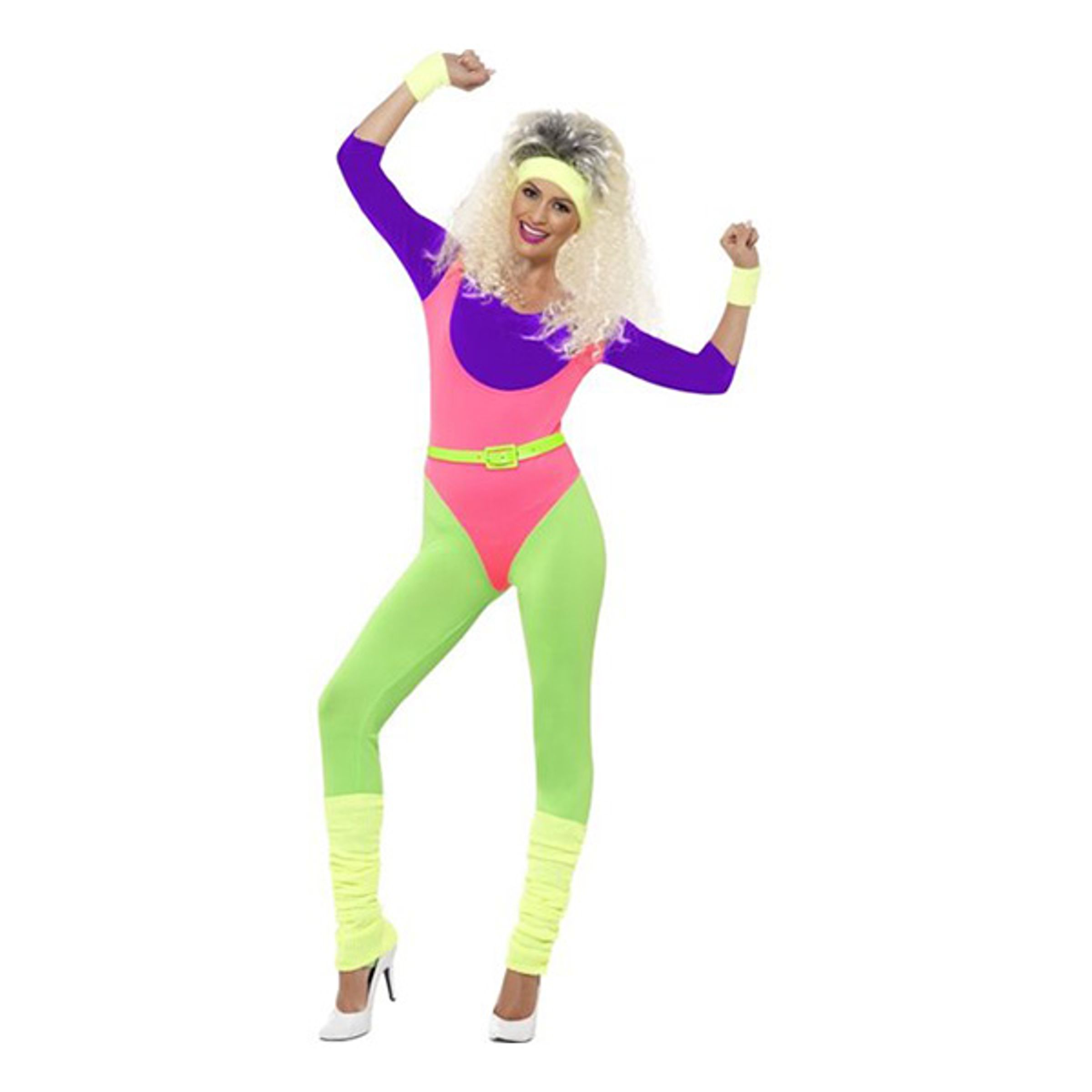 80-tals Träningsdress Maskeraddräkt är en tidstypisk dräkt med starka neonfärger och tight passform. Dräkten inkluderar en helkroppsdräkt med gröna ben, lila armar och bröstparti samt rosa på överkroppen. Handleds- och hårband ingår.