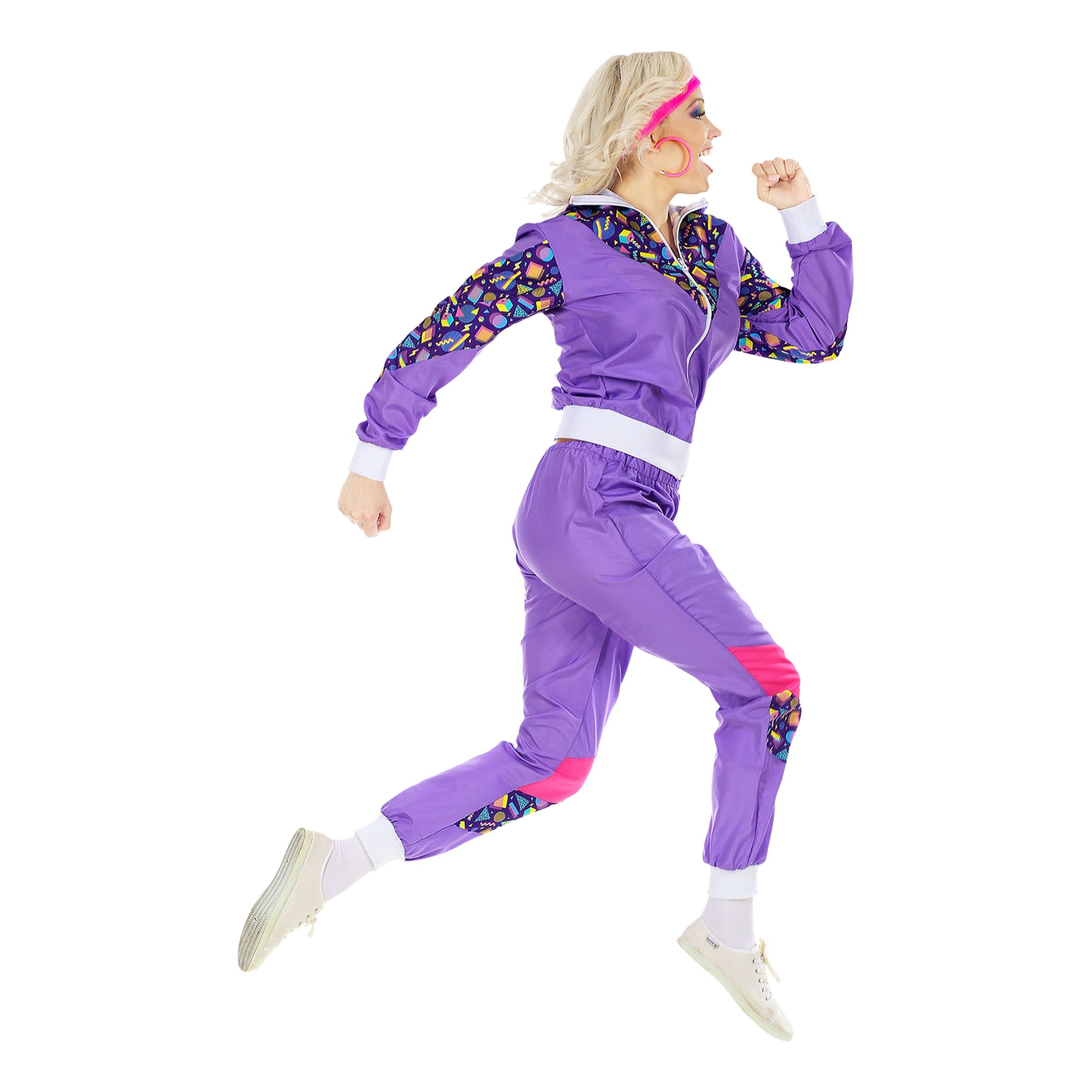 80-tals Träningsoverall Lila Maskeraddräkt innehåller en jacka och ett par byxor i fantastisk lila färg. Dräkten har partier med mönster och även några med rosa färg, allt för att maximera den sportiga känslan.