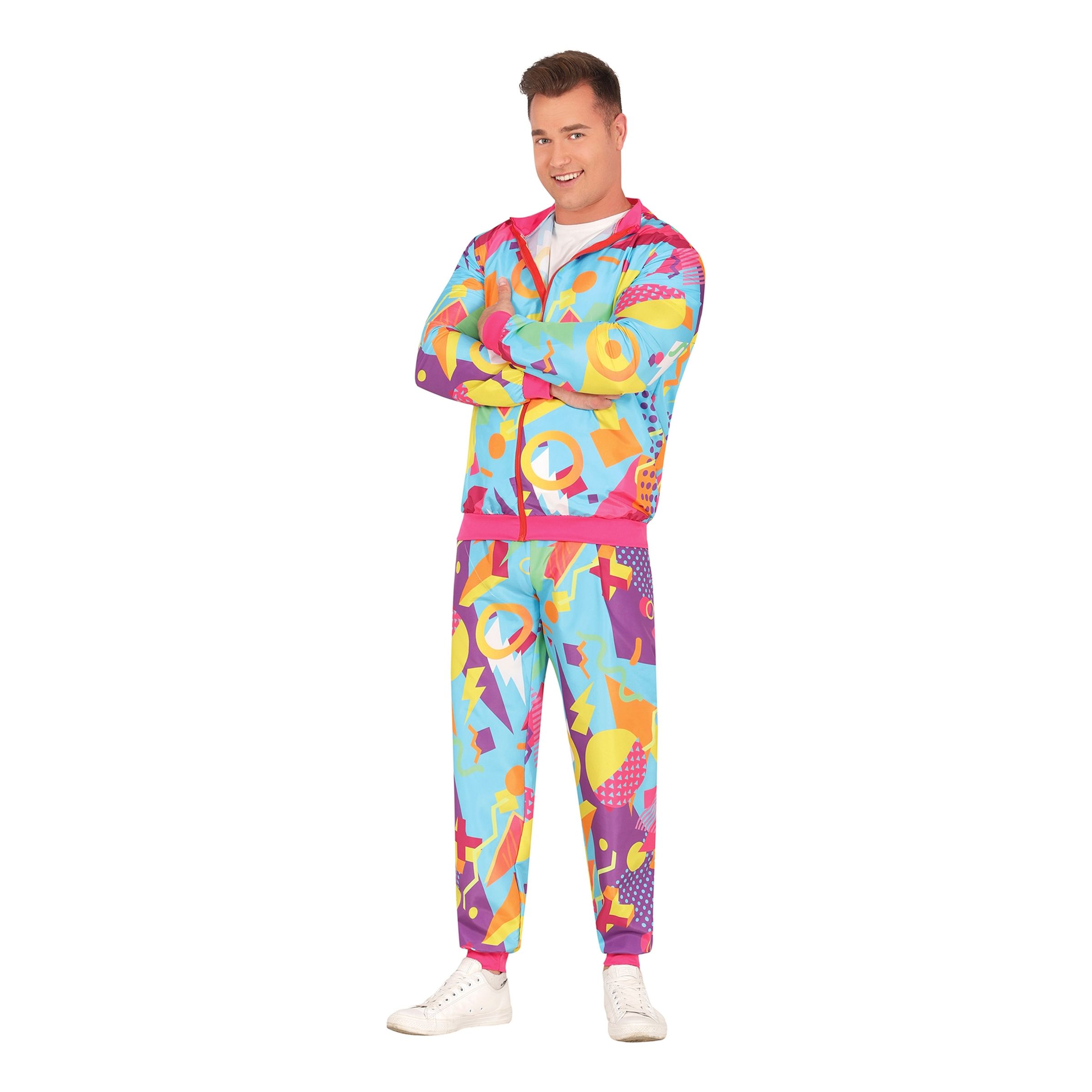 90-tals Träningsoverall Maskeraddräkt består av en ljusblå träningsjacka med flashigt 90-talsmönster i olika färger med rosa muddar och dragkedja framtill. Medföljer gör ett par matchande träningsbyxor i samma flashiga mönster och färger. Köp till accessoarer för en maxad 90-talslook!
