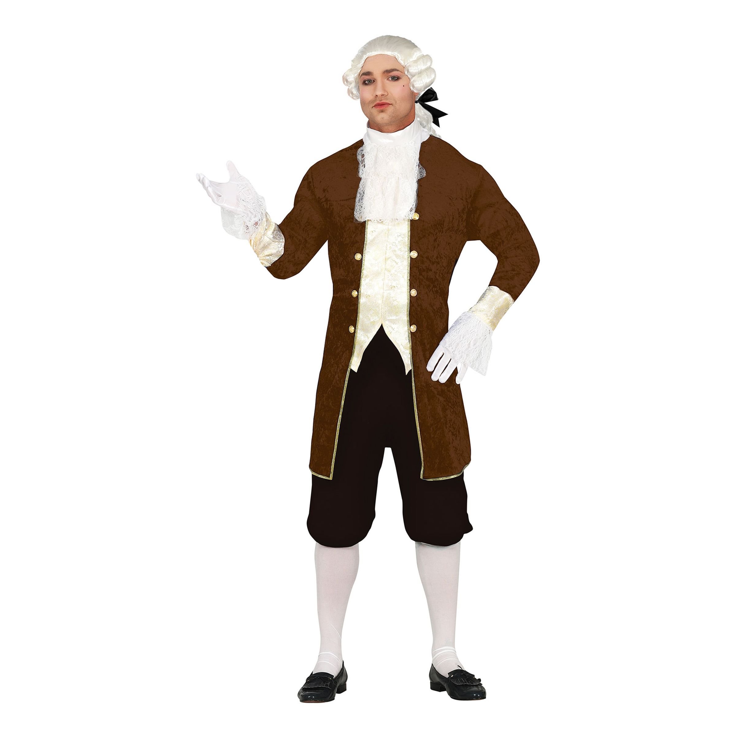Adelsman Maskeraddräkt är en brun lite längre jacka med krås i vita och guldfärgade detaljer och ett par matchande svarta byxor som slutar nedanför knäna. Komplettera med peruk, handskar och knästrumpor.