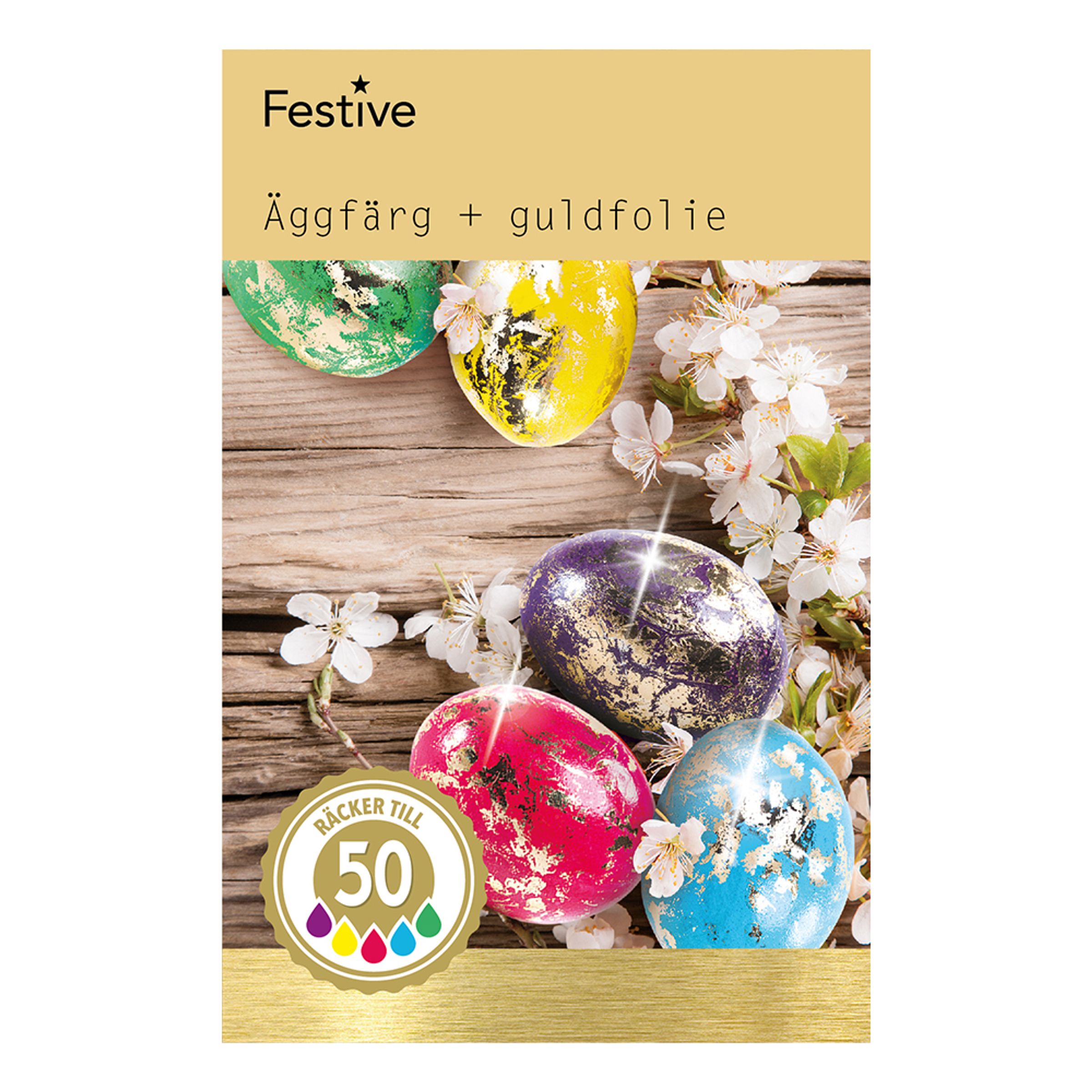 Äggfärg Guldfolie innehåller grön, gul, lila, rosa och blå äggfärg samt guldfolie som du fäster på äggen för att få till en lyxig känsla! Dina tjusiga ägg kommer garanterat bidra med en festlig stämning på påskbordet!