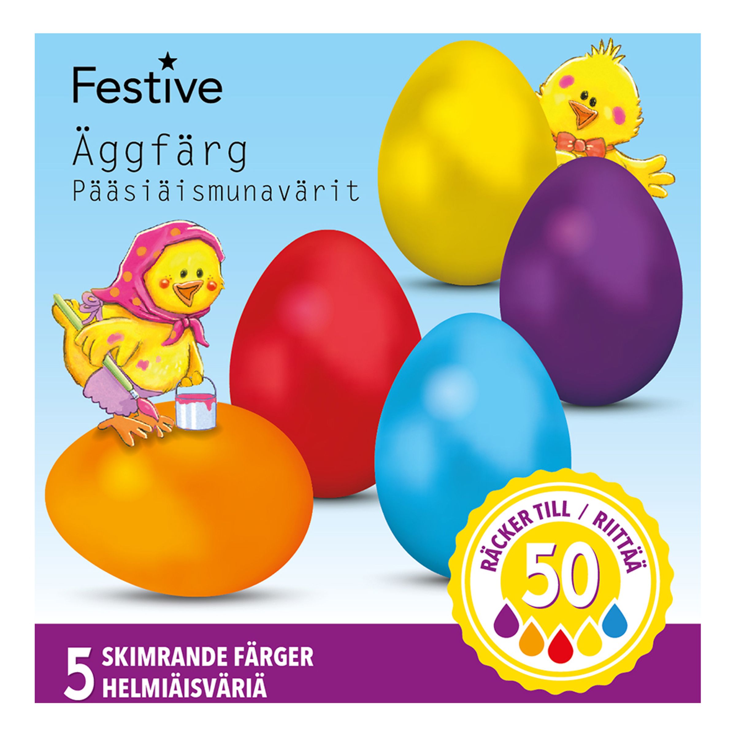 Äggfärg Pärlemor innehåller 5 olika färger i gul, lila, blå rosa och orange i en skimrande pärlemo-lyster. Dina ägg kommer garanterat bidra med en festlig stämning till påskbordet!