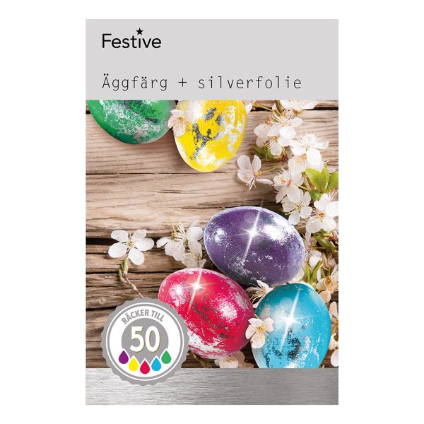 Äggfärg Silverfolie innehåller grön, gul, lila, rosa och blå äggfärg samt silverfolie som du fäster på äggen för att få till en lyxig känsla! Dina färgglada och skimrande ägg kommer garanterat bidra med en festlig stämning på påskbordet!