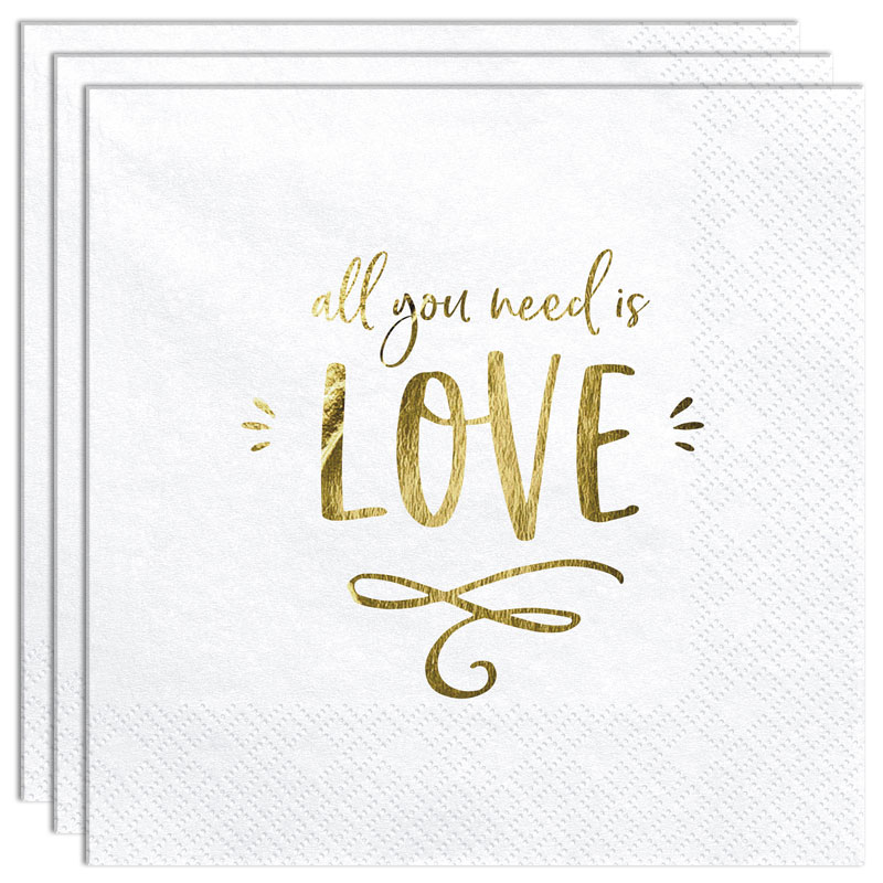 All You Need Is Love Servetter består av vita servetter med fin "All You Need Is Love" text i metallic guld. Servetterna har 3 lager och är tillverkade av papper.