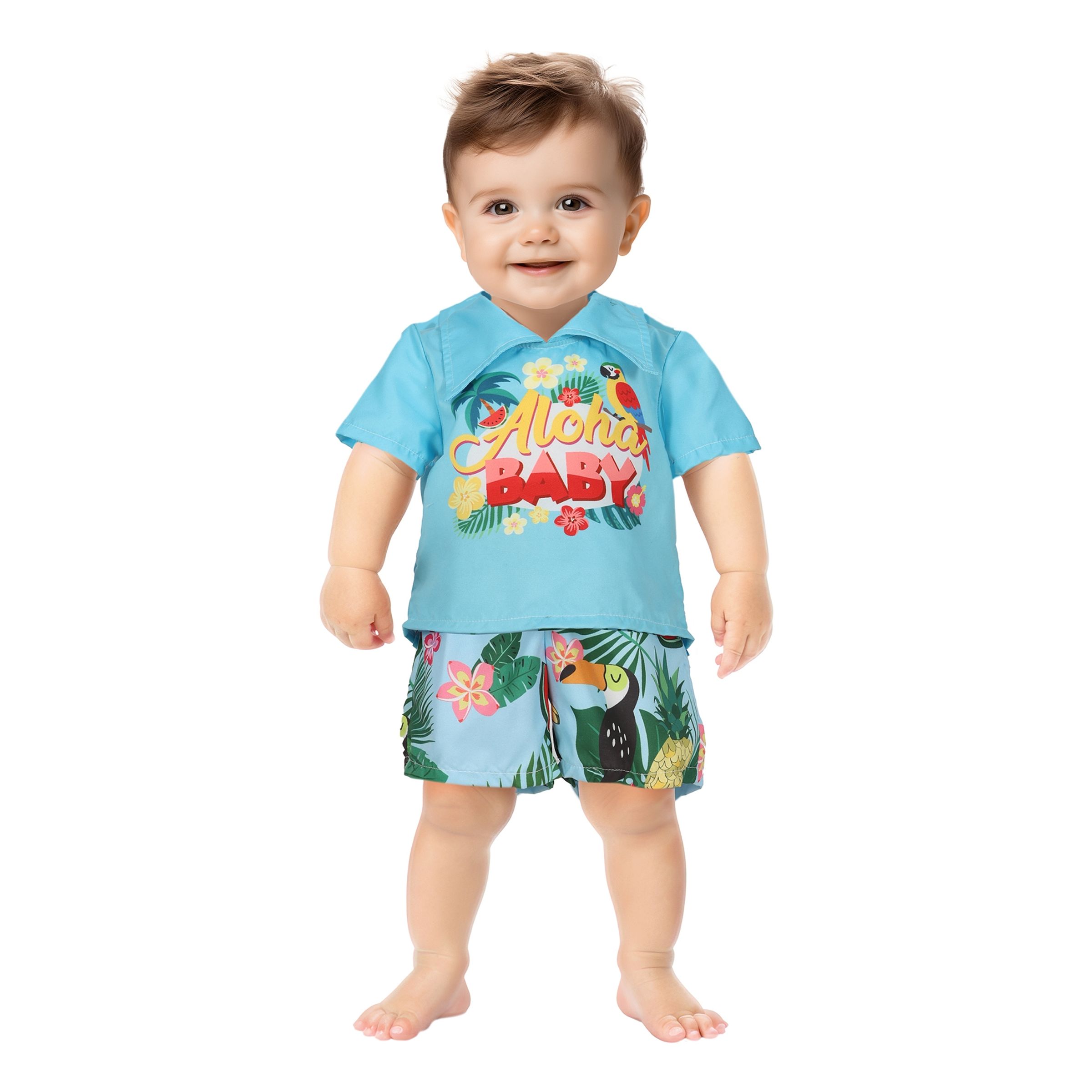 Aloha Baby Bebis Maskeraddräkt inkluderar en blå T-shirt med blommigt tryck och texten "Aloha Baby" på, samt ett par matchande shorts. Perfekt för sommarfester, maskerad eller en solig semesterdag hemma.