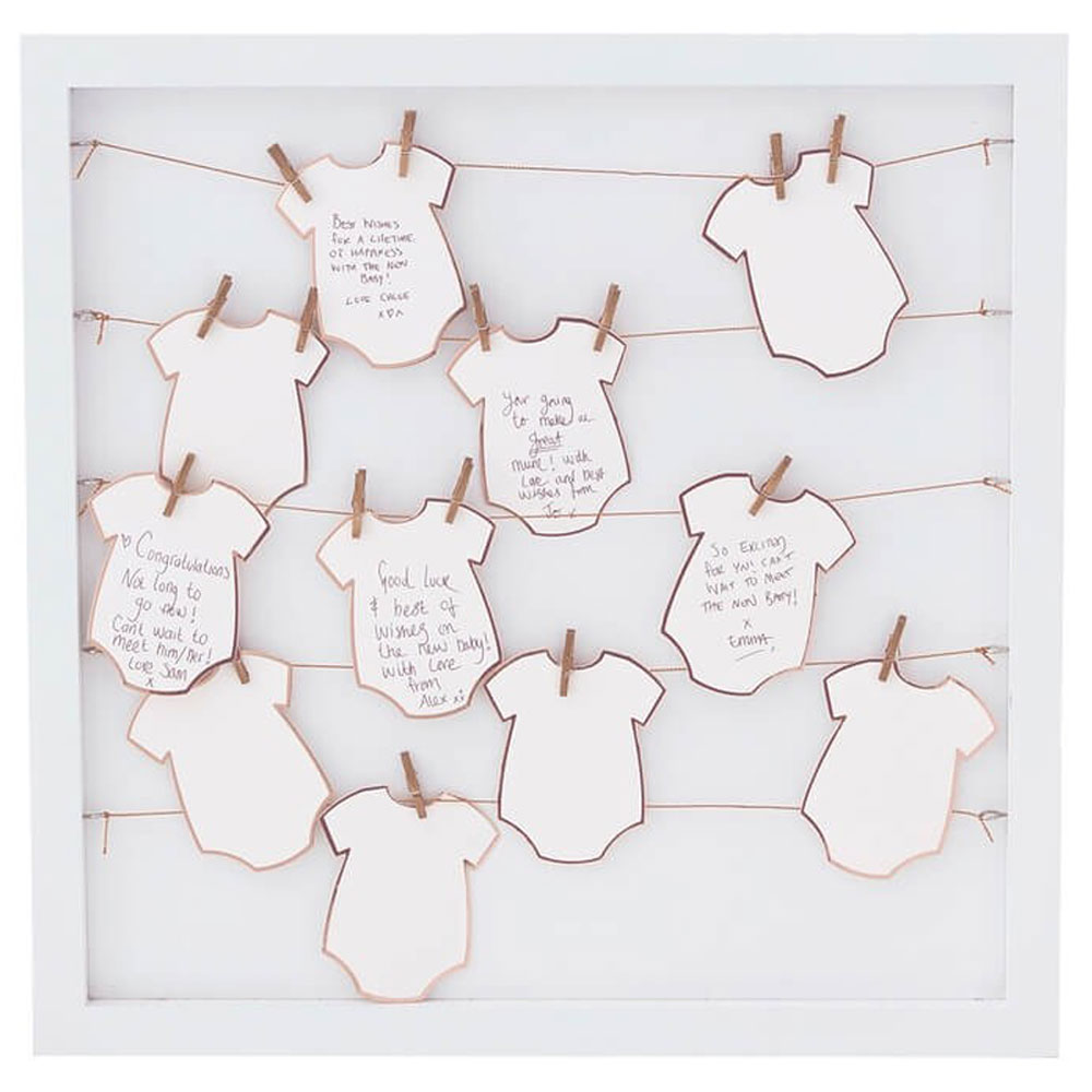 Alternativ Baby Gästbok består av en fin ram i vitt med 5 snören tvärs över ramen. Ingår även 24 stycken lappar i bebis body form, samt 24 stycken små klädnypor. Låt dina baby shower eller dop gäster skriva en hälsning, ett råd eller något annat passande på dem små lapparna för att sedan nypa fast dem i ramen m ed hjälp av klädnyporna.