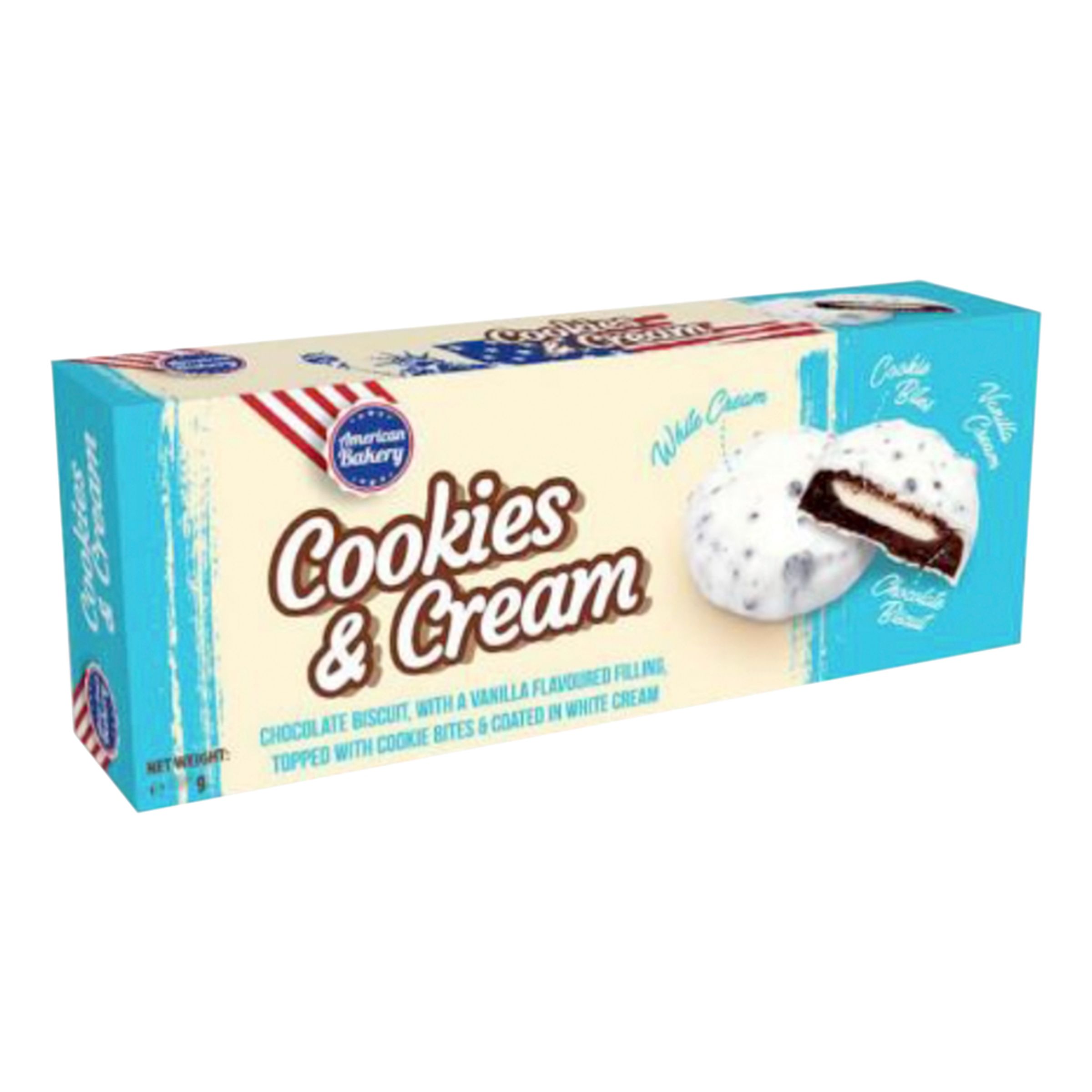 American Bakery Cookies & Cream innehåller chokladkakor med fyllning av vanilj toppad med cookie bites och white cream-glasyr.
