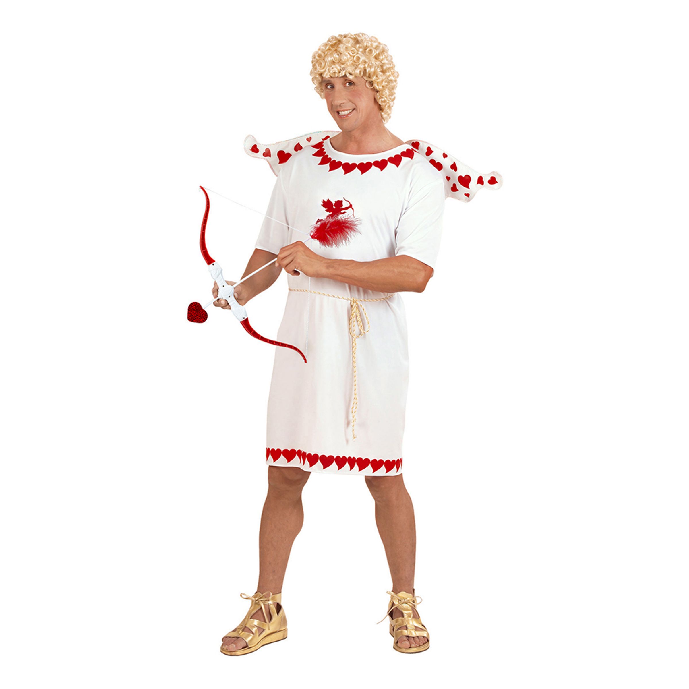 Amor Maskeraddräkt består av en vit tunika med ett rött tryck av guden Amor på bröstet, ett beige bälte och vingar. Herrdräkten är gjord i polyester. Den kan exempelvis användas på en maskerad eller en tillställning på Alla hjärtans dag.
