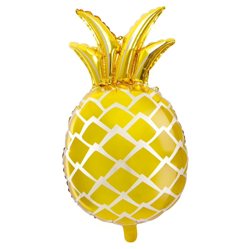 En festlig ananas ballong i silver och guld blir utan tvekan en snygg dekoration till kalaset eller festen i härligt sommar-tema. Blås upp folieballongen med luft eller helium och låt den sedan utsmycka ditt firande på egen hand eller tillsammans med andra matchande ballonger, girlanger och serpentiner.