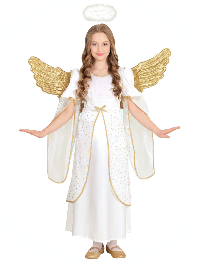 Ängel Maskeraddräkt Barn innehåller en vit ängel klänning med guldiga kanter, långa hängande ärmar samt fina stjärnmotiv i guld.