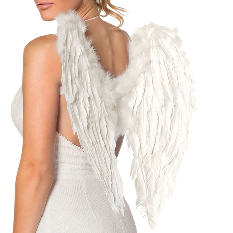Änglavingar Vita Deluxe består av ett par vita vingar gjorda av fjädrar. Fästs på ryggen med resårband över axlarna. Dessa är i hög kvalitét och så verklighetstrogna ett par änglavingar kan bli.