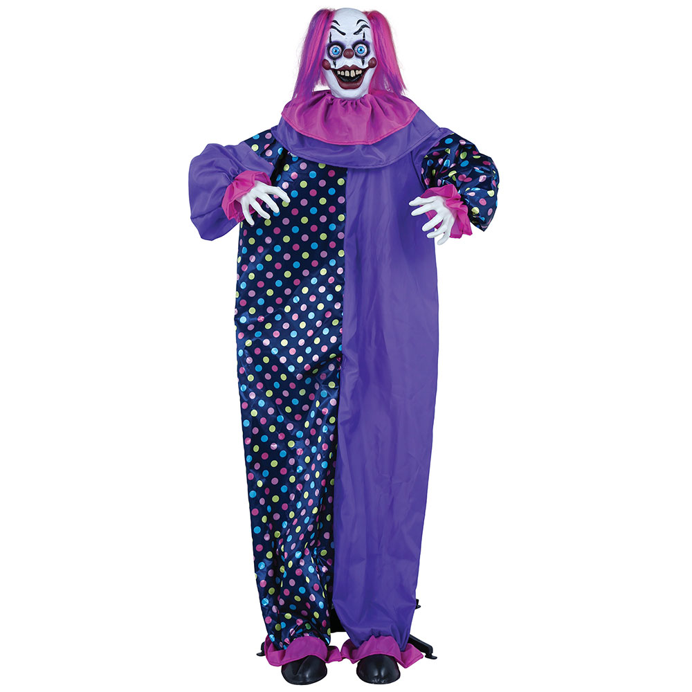Animerad Clown 160 cm omfattar en Halloween-rekvisita i form av en clown som kan röra sig och låta. Clownen har inbyggda LED-lampor i ögonen och är klädd i en dräkt som är hälften lila och hälften svart med flerfärgade prickar.