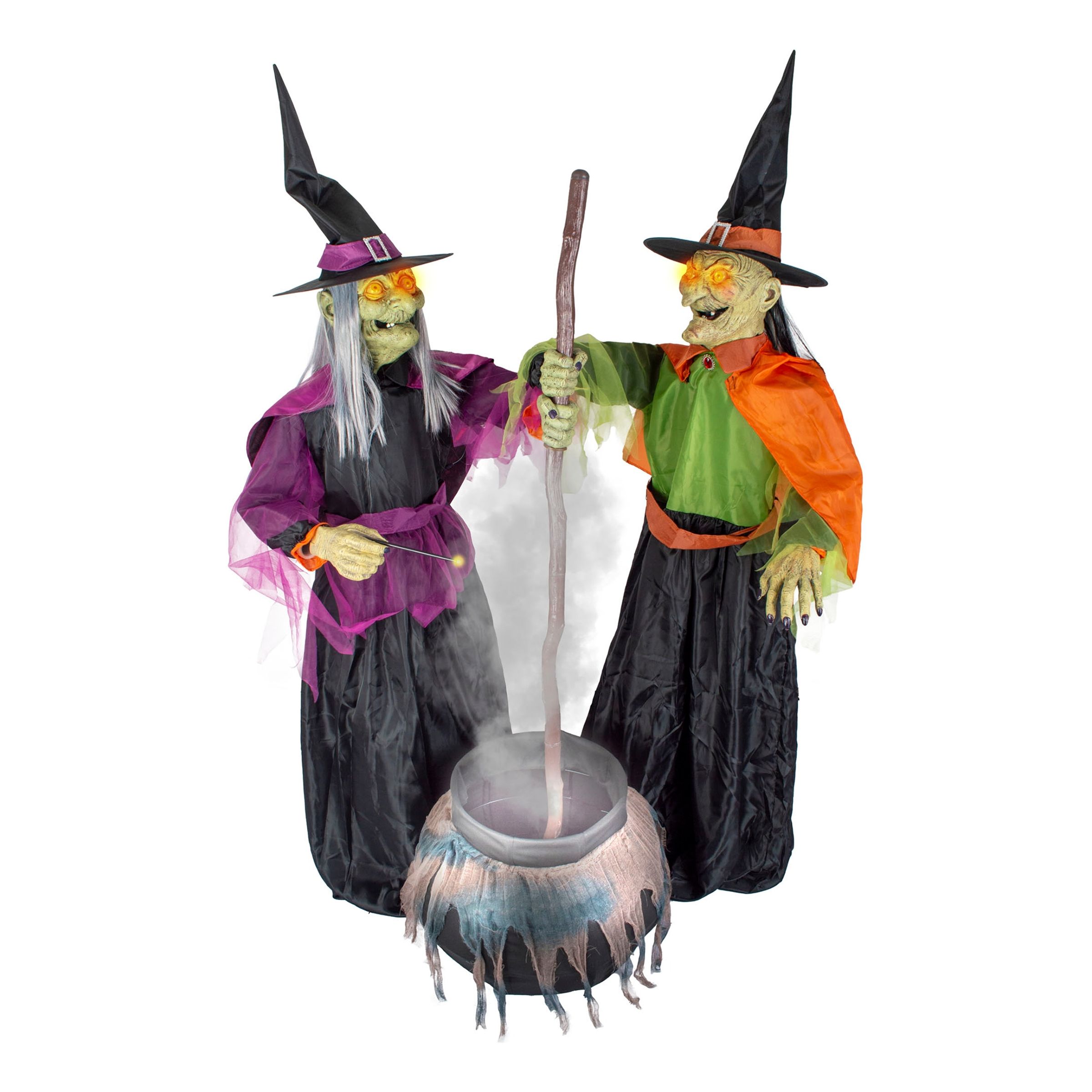 Animerade Häxor med Kittel Ljud & Ljus Prop inkluderar två häxor i naturlig storlek som pratar med varandra medan de rör om i kitteln tillsammans. Spännande musik spelas och damerna rör sina huvuden fram och tillbaka medan deras ögon glöder.