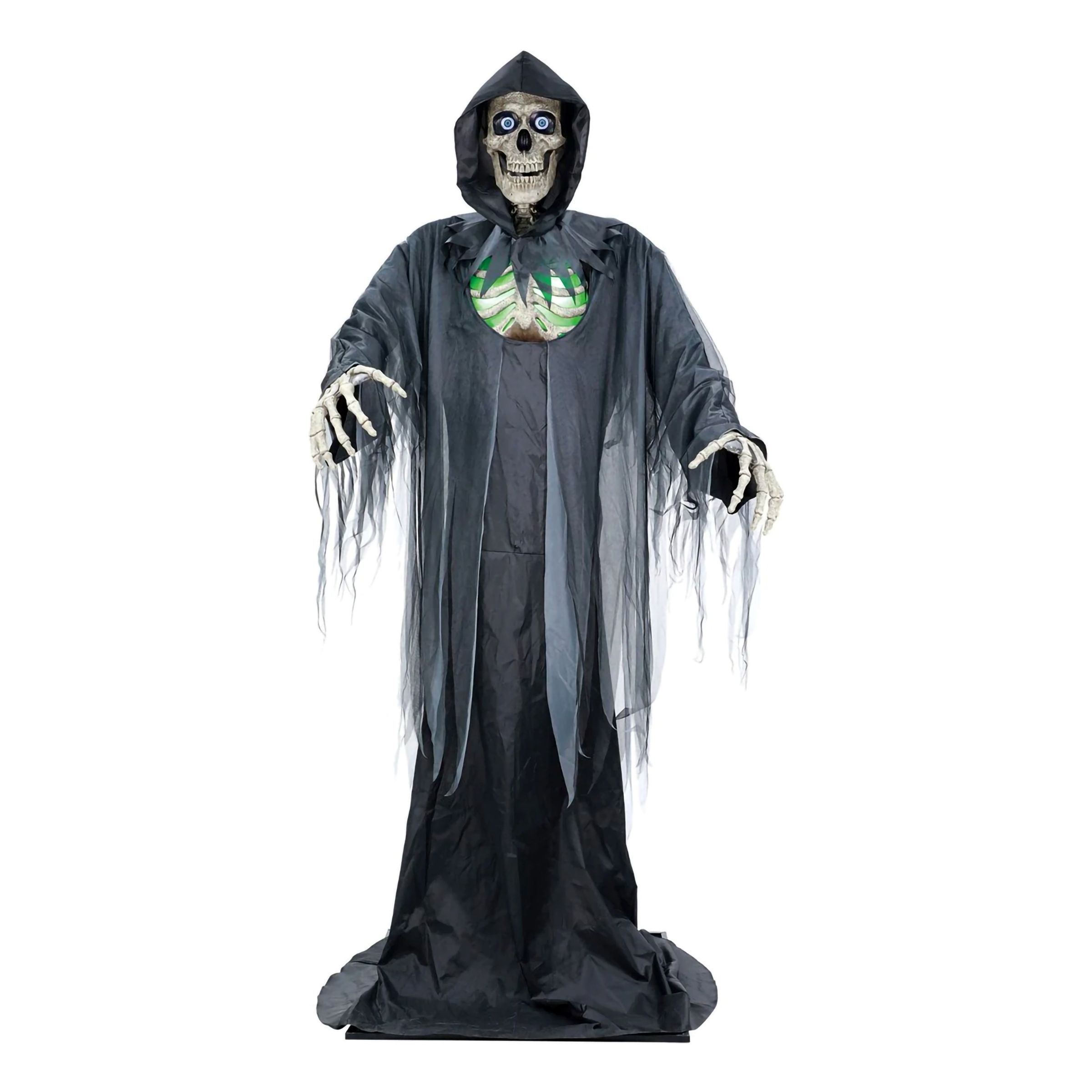 Animerat Skelett med Ljud & Ljus Prop är en maffig Grim Reaper täckt i lång svart/grå huvklänning. Under huvan syns ett skelettliknande ansikte med genomträngande ögon. Även bröstpartiet lyser upp i en kuslig grön färg när propen kommer till liv. Propen rör på sig och säger läskiga meningar på engelska med kusliga bakgrundseffekter.