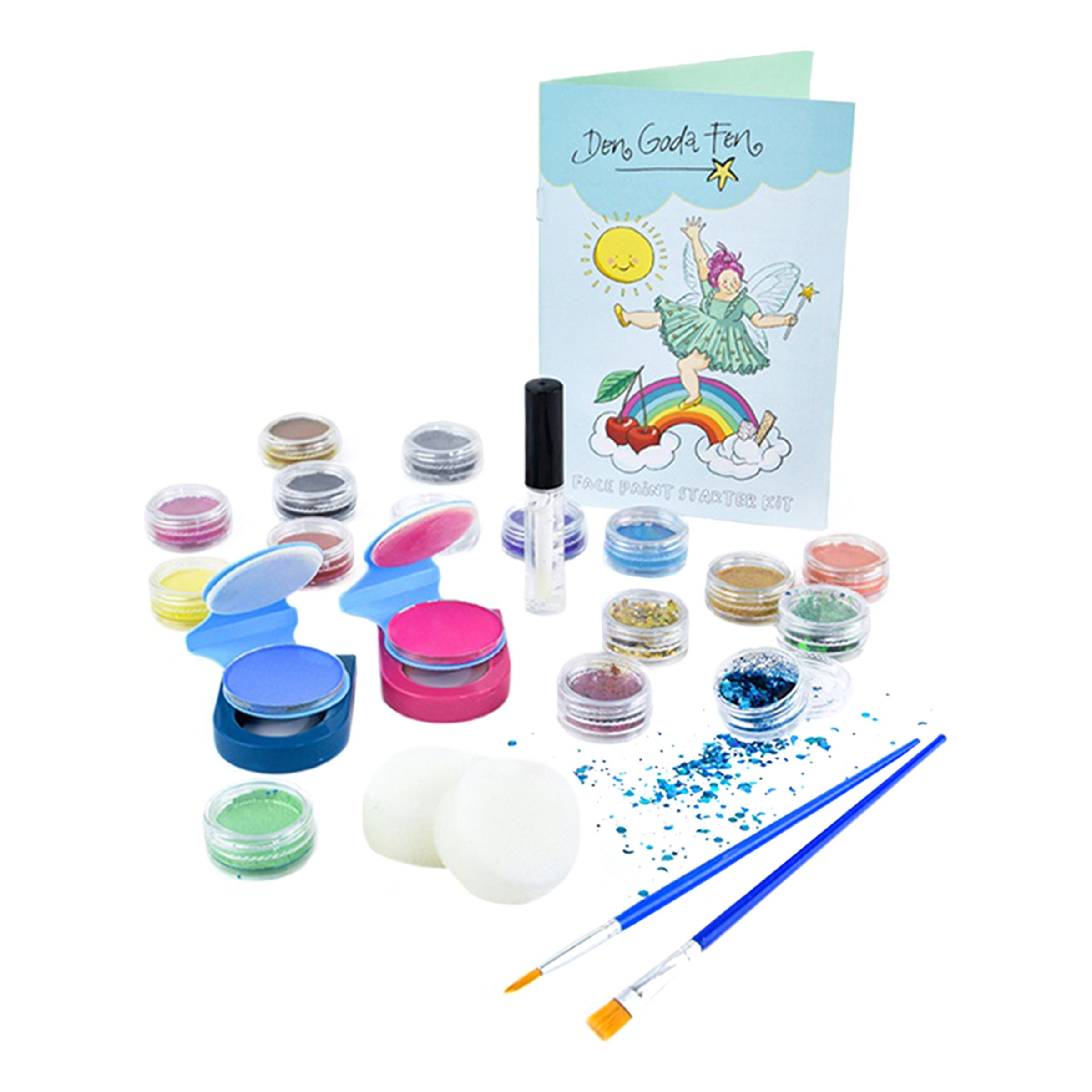 Ansiktsmålning Den Goda Fen Kit inkluderar en mängd tillbehör, glitter, penslar och färger som kan användas på både kroppen och i ansiktet. Färgerna passar vuxna och barn från tre års ålder. De är giftfria och vattenlösliga och tvättas enkelt bort med ljummet vatten.