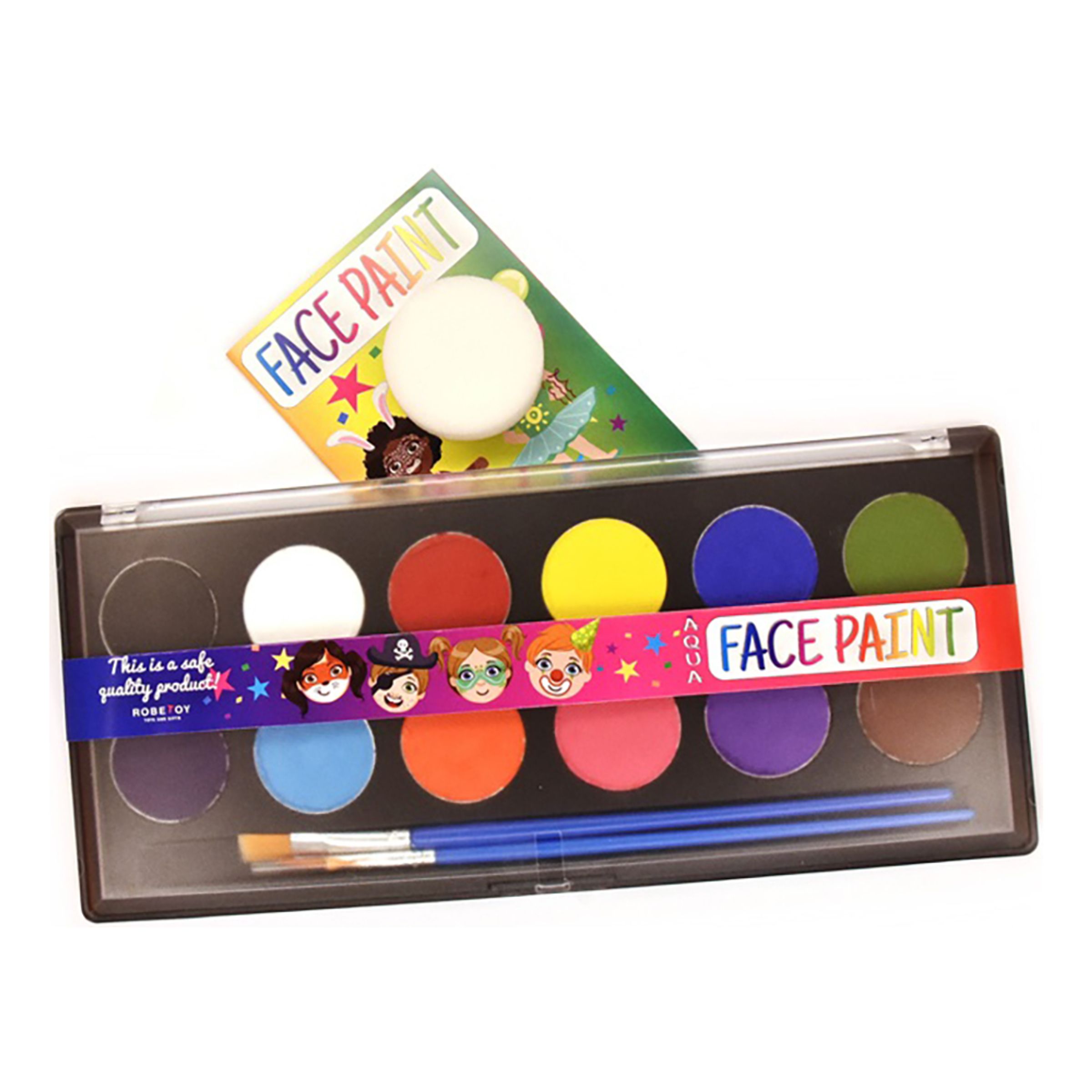Ansiktssmink Animals inkluderar tolv stycken vattenlösliga färger, två penslar i olika storlekar och en svamp. Med färgerna kan du rita på ansiktet och på kroppen. Du tvättar enkelt bort dem med ljummet vatten.