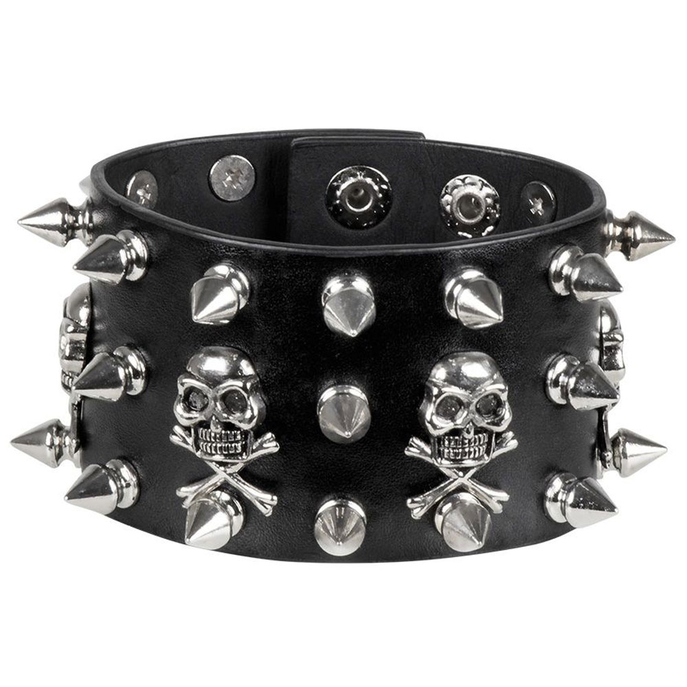 Ett snyggt armband kan göra mycket till en fest outfit eller maskerad utklädnad och med detta tuffa armband får du enkelt till en riktigt cool look. Det här breda armbandet i svart med silvriga nitar och döskallar är det rätta valet av tillbehör till exempelvis en rock eller punk utklädnad.
