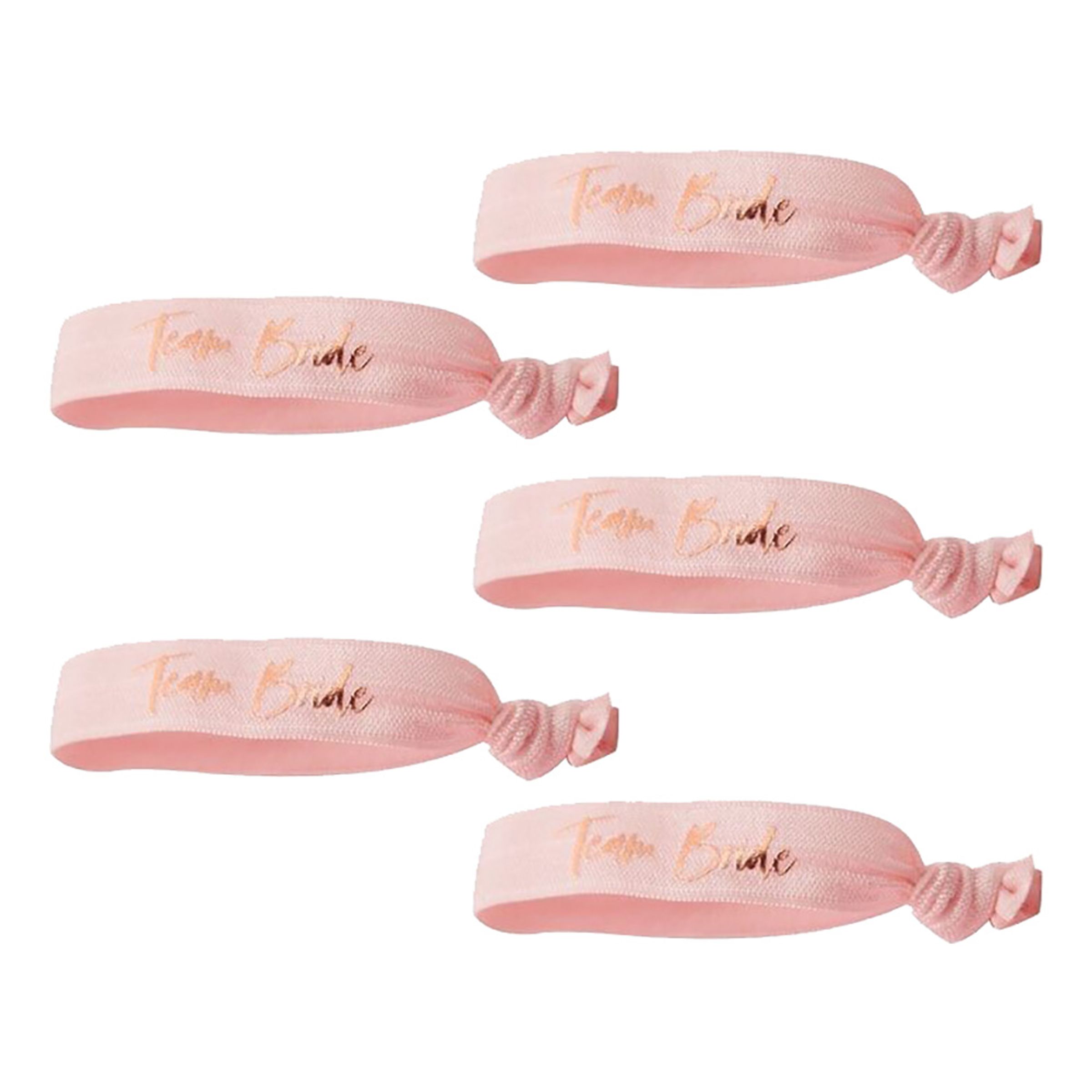 Armband Team Bride är fina, rosa band i polyester som är diskreta och snygga accessoarer på möhippan. Texten "Team Bride" är tryckt i guld på armbanden. Armbanden har en avslappnad och chic stil med en justerbar knut som "lås".