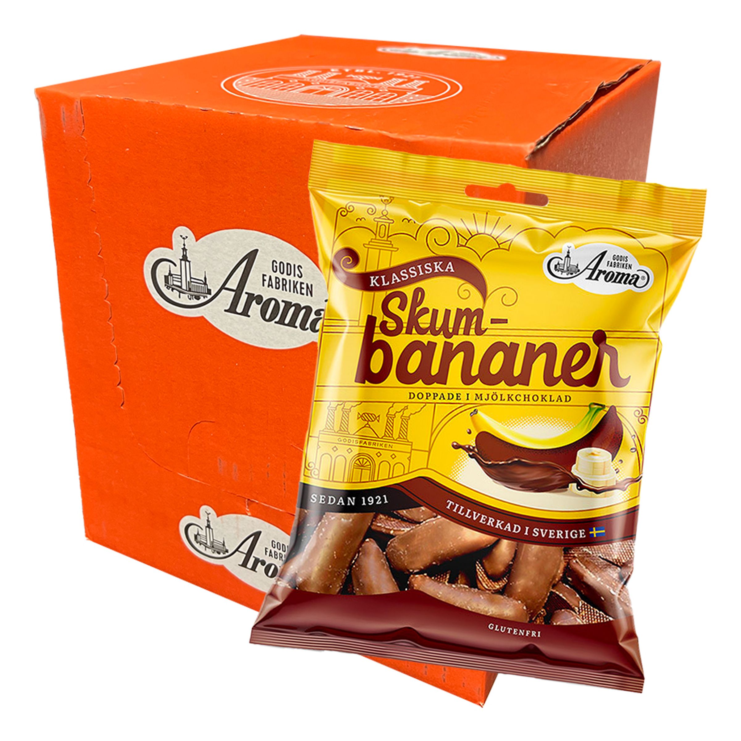 Aroma Chokladbananer Skum Storpack är skumgodis med banansmak och chokladhölje. Säljs i låda med 10 påsar.