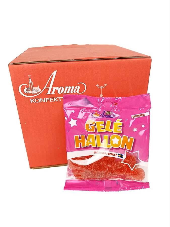 En hel låda med 20 st påsar om 80g fyllda med Aromas klassiska gelehallon. Godiset som både ser ut som och smakar just hallon.