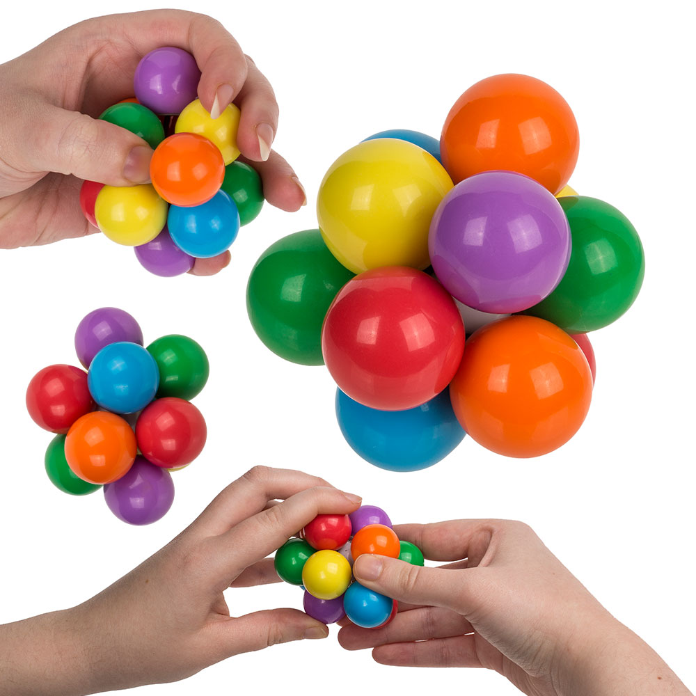 Atomisk Anti Stress Leksak omfattar en boll med färgglada plastbollar som sitter ihop med elastiska band och byter plats när man klämmer på den.