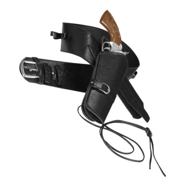 Riktigt snyggt och välgjort bälte och hölster i svart skinnimitation med snöre att knyta runt låret så hölstret håller sig på plats.