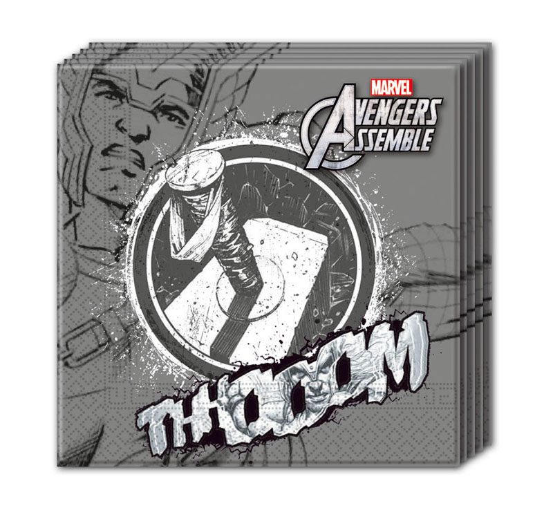 Servetter med superhjälten Thor från filmen Avengers. Coola och inte alls fåniga servetter som alla större barn och deras kompisar kommer gilla. Snygga att kombinera med andra Avengerssaker, för att duka bordet med ett och samma tema.