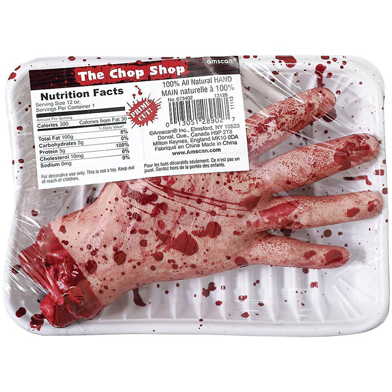 Avhuggen Hand Halloween Dekoration är tillverkad av plast och omfattar en blodig, avhuggen hand i förseglad förpackning med innehållsförteckning framtill.