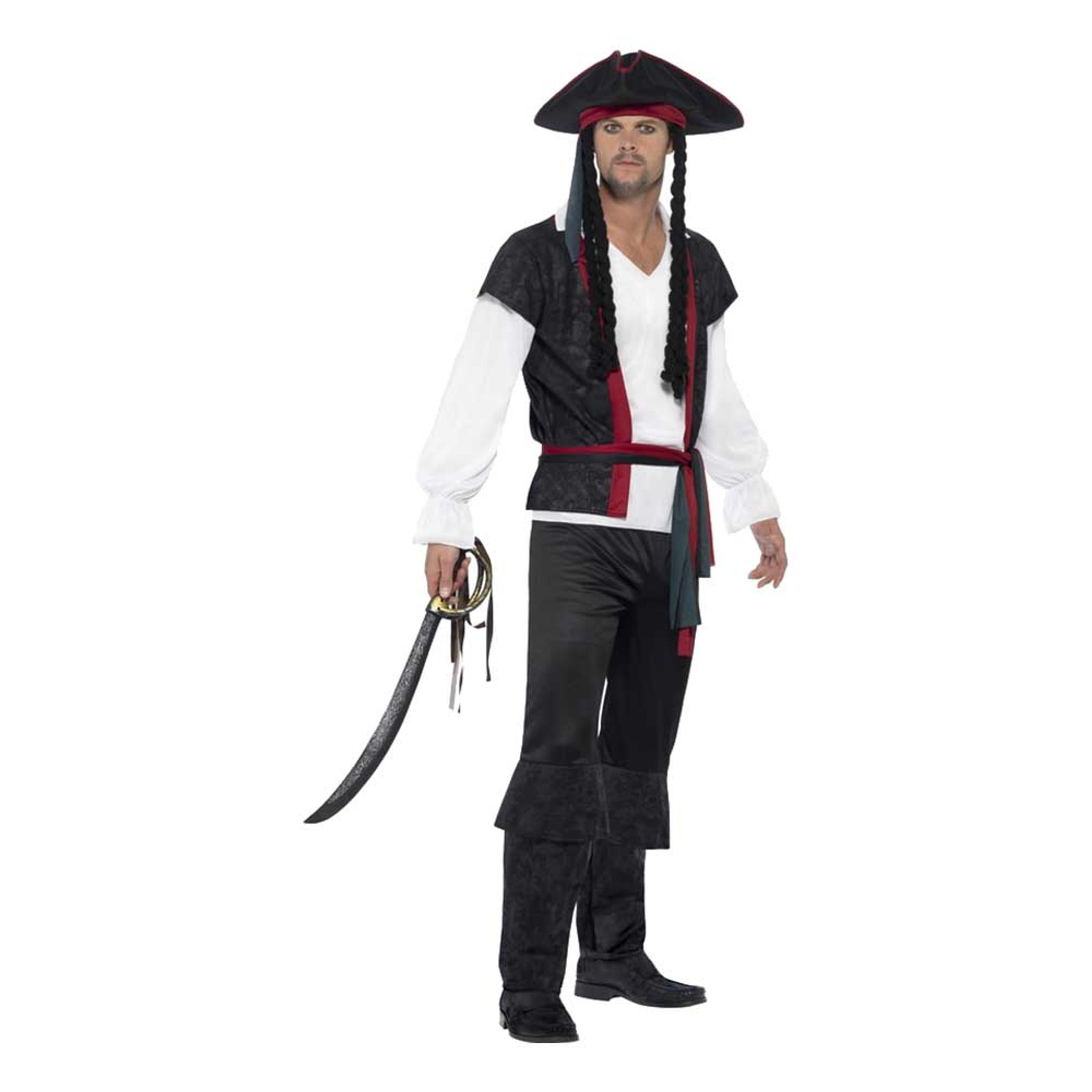 Aye Aye Kapten Maskeraddräkt inkluderar en vit långärmad skjorta med fastsydd svart väst, ett par matchande svarta byxor, ett midjeband samt en svart hatt med fastsydda band och flätor. Skor, smink och svärd ingår ej. Komplettera med dessa för en komplett look.
