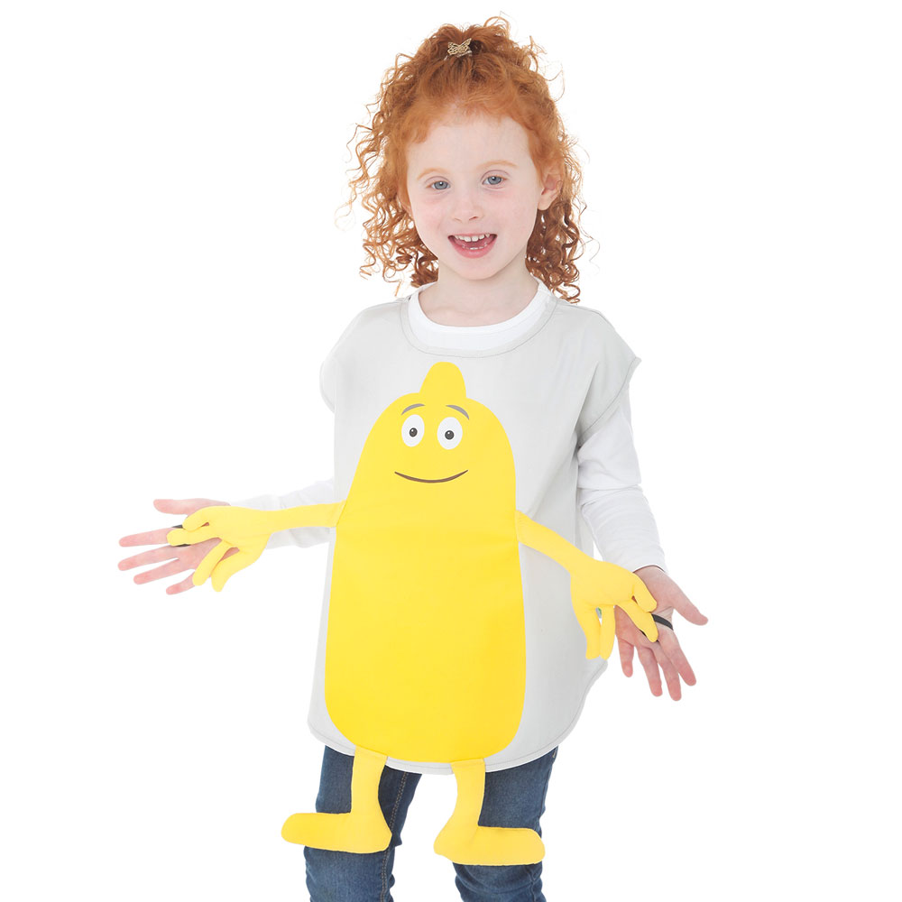 Bibbi, den mest tankfulla och försiktiga av Babblarna brukar oftast bara gå runt och observera saker, nu kan även ditt barn vara Bibbi med den här superhärliga utklädnads kostymen som gör att barnen kan kramas och vinka fast med Babblarnas händer!