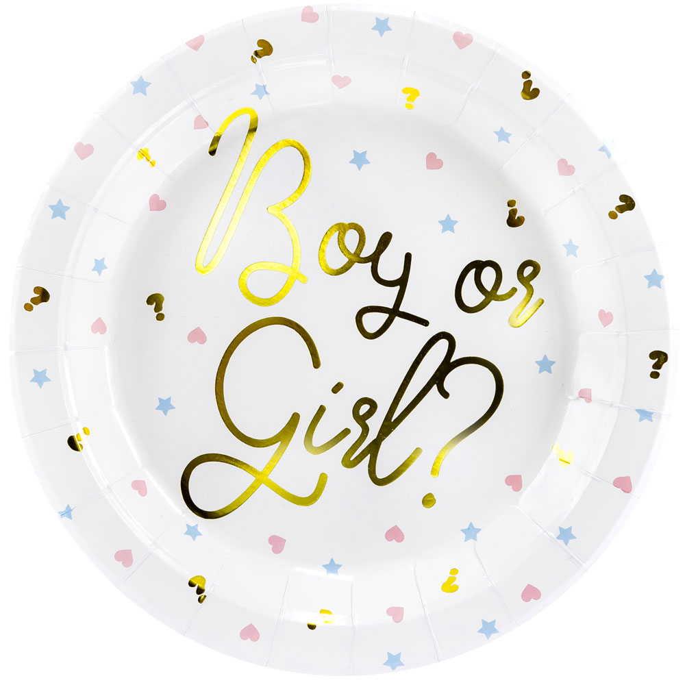 Baby Shower Boy or Girl Papptallrikar består av 6 stycken vita engångstallrikar med små rosa hjärtan, blåa stjärnor och guldiga frågetecken på, samt texten "Boy or Girl?" i guld. Tallrikar är tillverkade i papp.