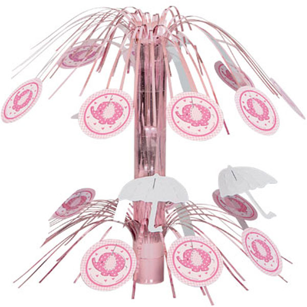 Baby Shower Girl Bordsdekoration Umbrellaphant är tillverkad av papp och omfattar utstickande foliefransar i rosa och vita nyanser med motiv av paraplyer samt elefanter.