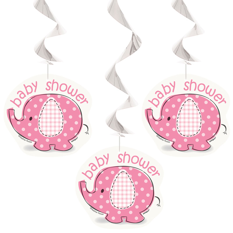 Baby Shower Girl Hängande Dekorationer Umbrellaphant kommer tillverkade av papp med motiv av rosafärgade elefanter samt texten "baby shower". Dekorationerna hängs av långa matchande folieskruvar.