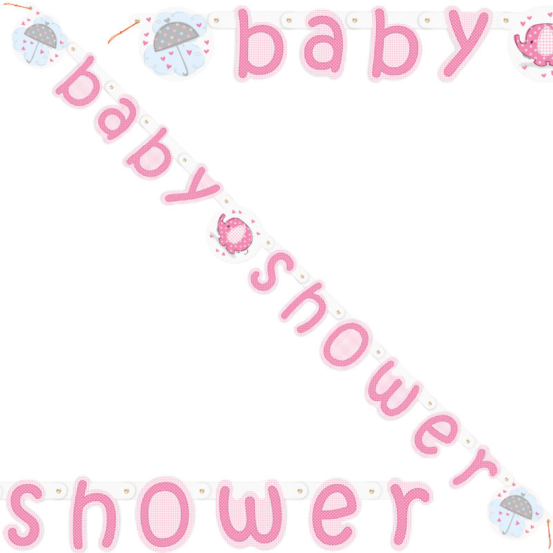 Baby Shower Girlang Girl Umbrellaphant är tillverkad av papp och kommer i rosa samt vita nyanser med motiv av små hjärtan, en elefant, två paraplyer samt texten "Baby Shower".