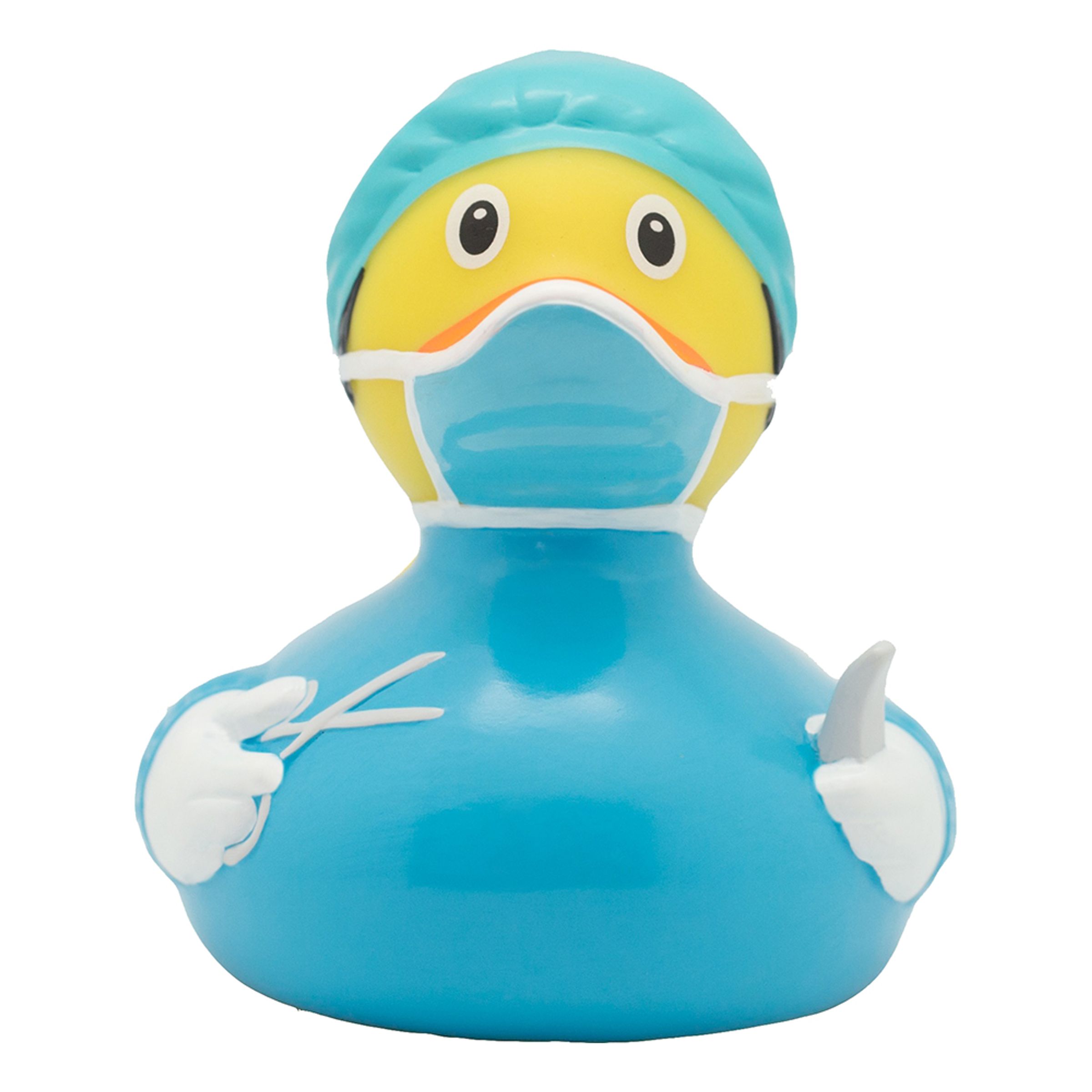 Badanka Kirurg är en gul badanka med en turkos och vit rock, mössa och munskydd. I vingarna håller han kirurginstrument. Badankan är tillverkad i gummi och är ca 8,5 x 7,5 x 8,5 cm stor.