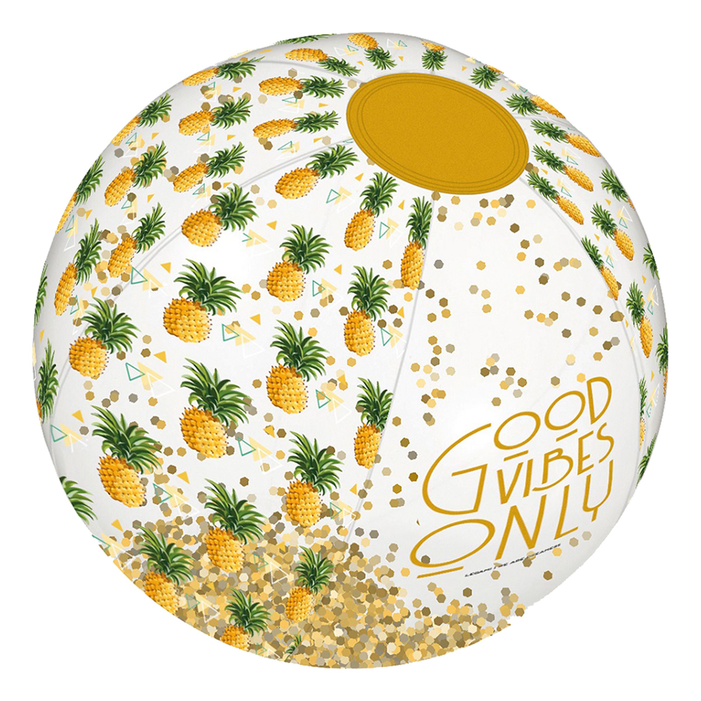 Badboll Pineapple är en uppblåsbar boll med små guldfärgade kulor inuti. Bollen är också dekorerad med små gula och gröna ananaser och på bollen står det "Good vibes only".