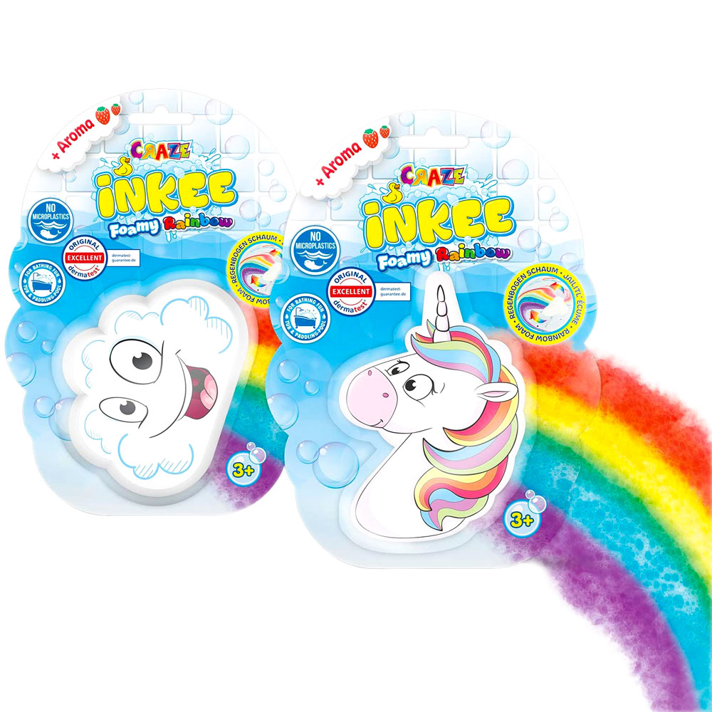 Badbomb med Regnbågsskum omfattar en jordgubbsdoftande badbomb med regnbågsfärgat skum. Badbomben finns med motiv av en enhörning och ett moln, vilken du får blir en överraskning.