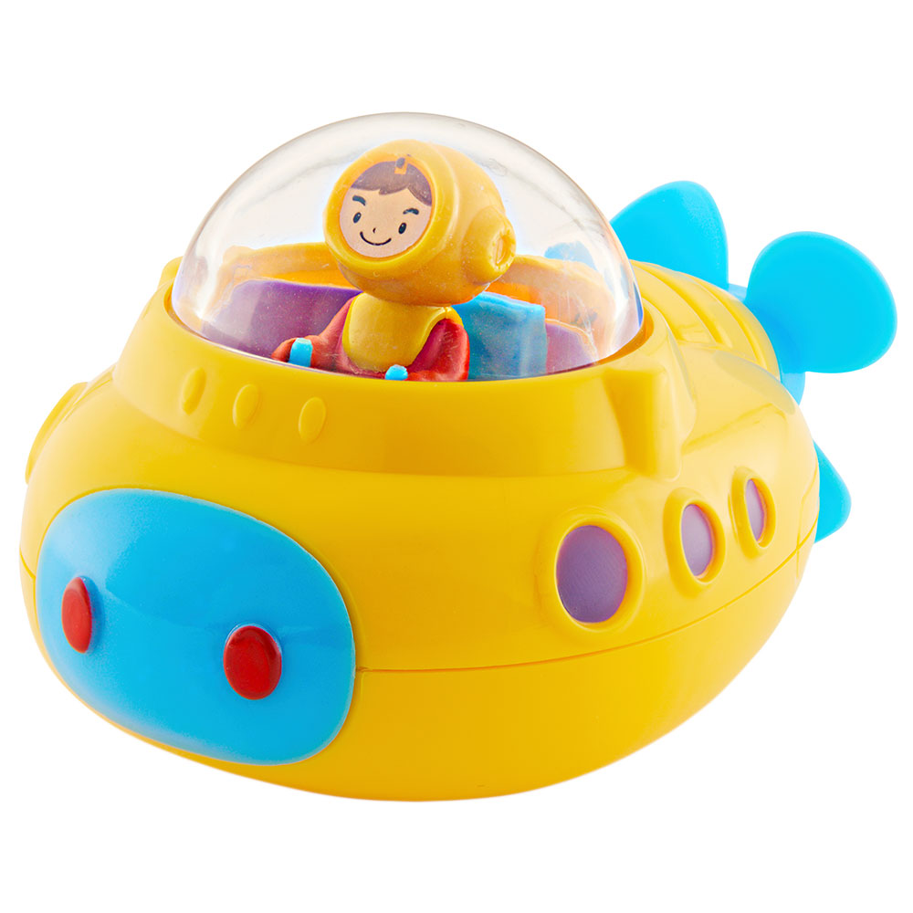 Badleksak Ubåt med Skallra omfattar en badleksak i form av en gul ubåt med lila fönster, en blå propeller, en förare som sitter på sin blå stol i en cockpit i form av en boll som fungerar som en skallra, där små gula och blå bollar rör sig när den vrids.