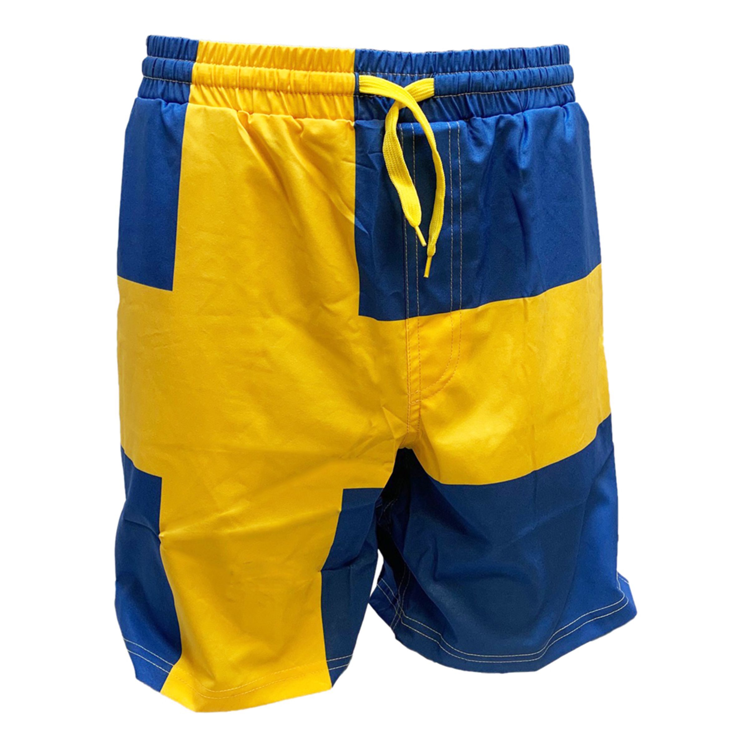 Badshorts Sverige är ett par riktigt snygga badshorts med motiv av den svenska flaggan. Badbyxorna finns i fem olika storlekar för vuxna. Badbyxorna har resår i midjan tillsammans med snörning och två stycken framfickor. Observera att shortsen är ganska små i storlekarna, så är din vanliga storlek small, bör du ta storlek medium.
