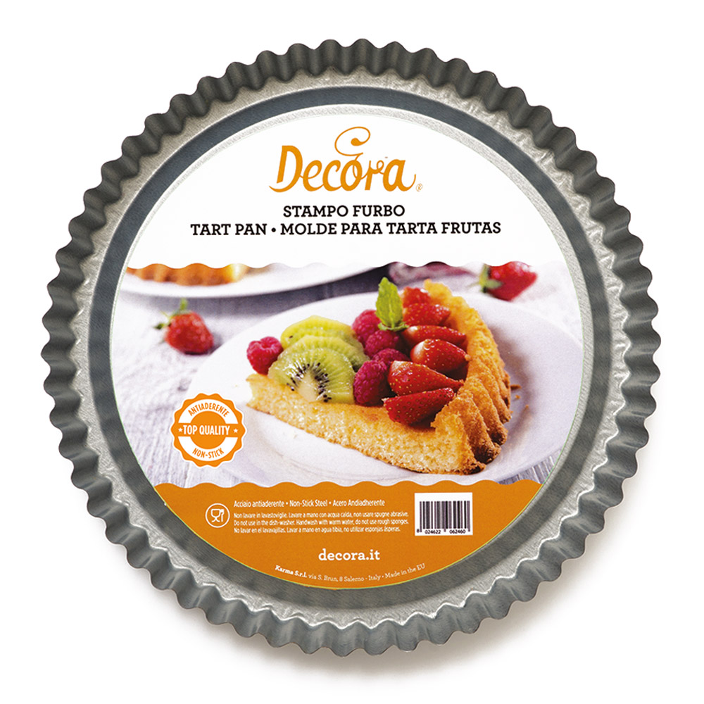Bakform 24 cm består av en rund bakform med räffliga kanter. Formen är tillverkad av non-stick rostfritt stål.