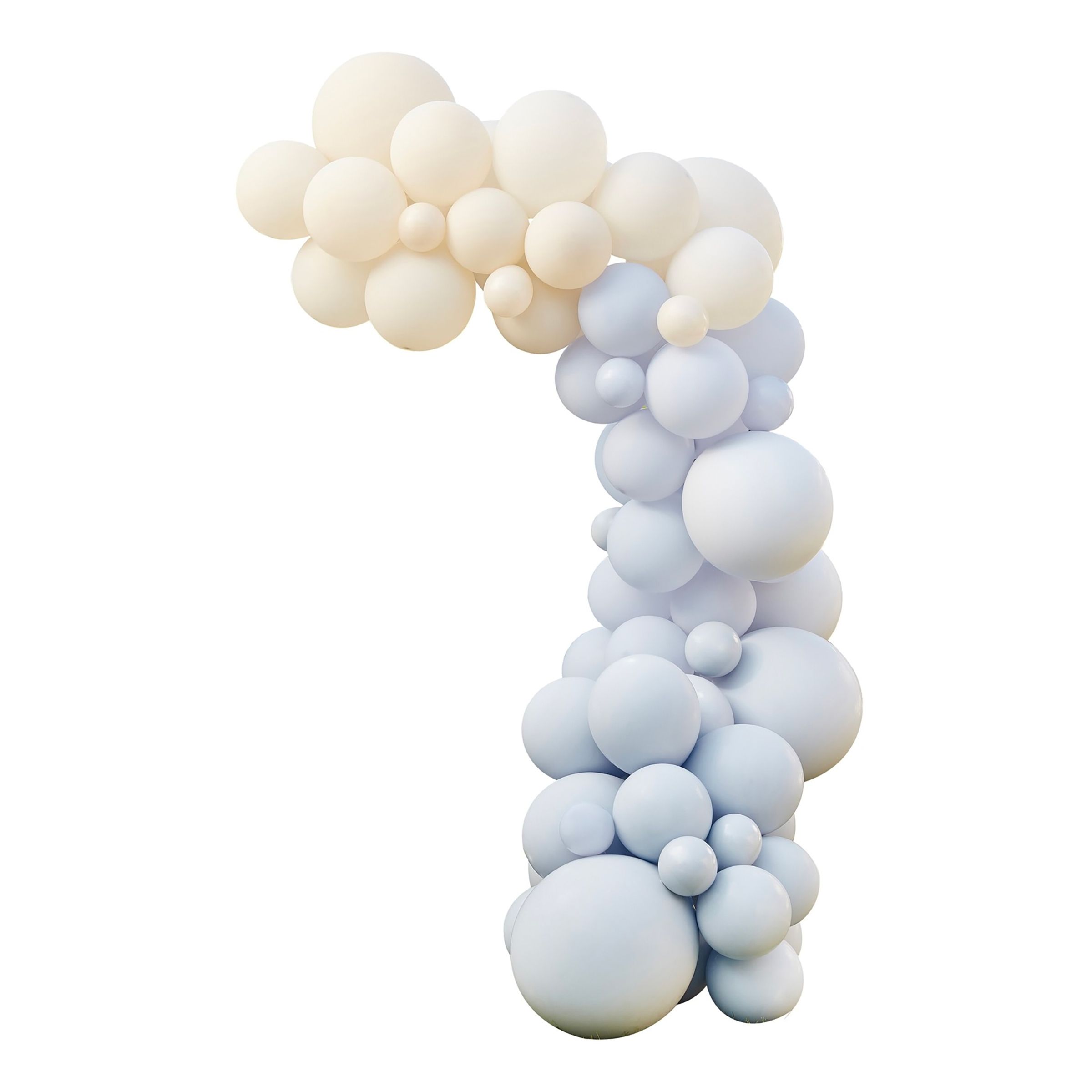 Ballongbåge Ljusblå/Créme inkluderar 75 stycken ballonger i varierande storlekar och färger. Den monteras med hjälp av ett medföljande plastband som ballongerna enkelt träs på, och då skapas det bågformade utseendet. Mindre ballonger fästs enkelt med medföljande tejpprickar. Latexballongerna är biologiskt nedbrytbara.