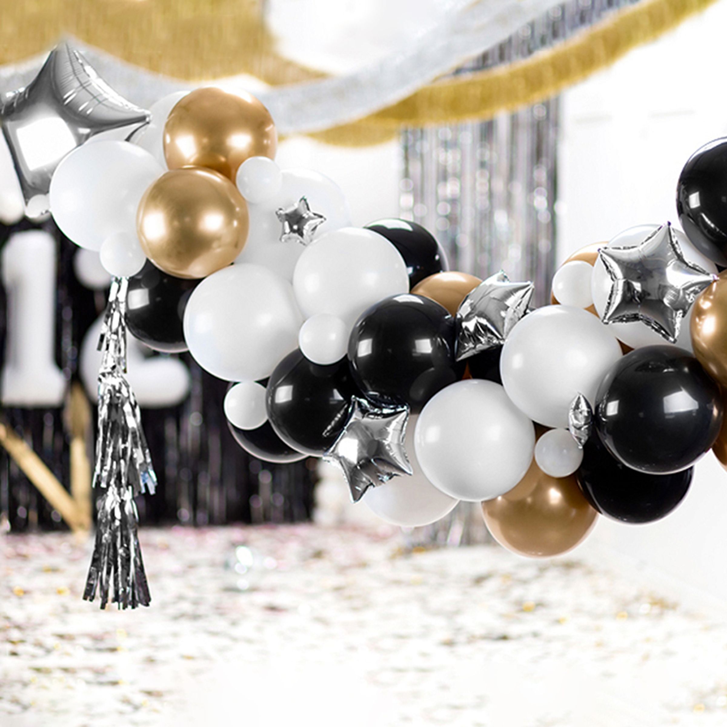 Ballongbåge med Stjärnor inkluderar totalt 52 stycken vita, svarta, guldiga och silvriga ballonger i olika storlekar och former. Ballongbågen består av både folieballonger och latexballonger och levereras komplett med tillbehör och instruktioner för enkelt montering.
